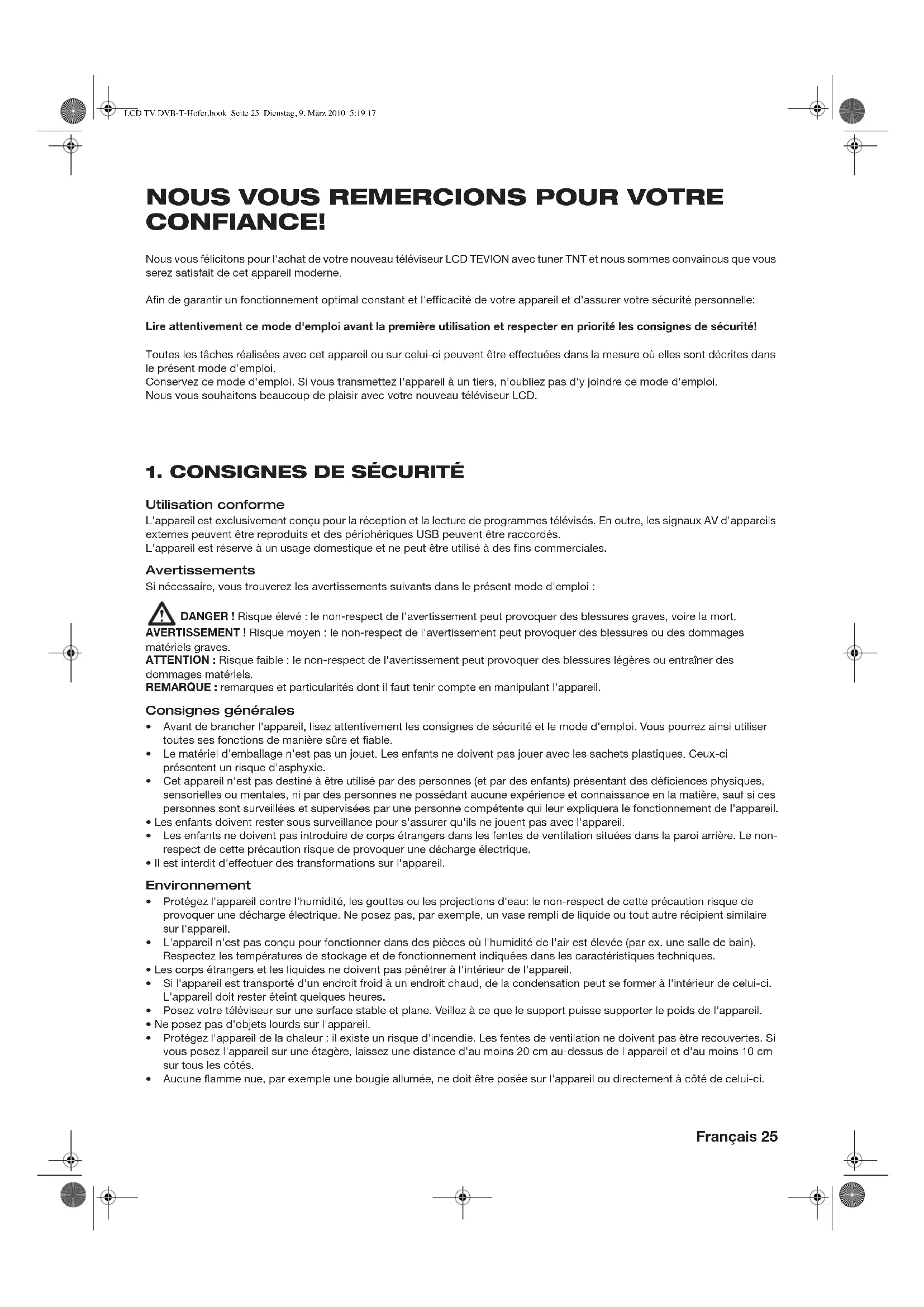 CONFIANCE! Nous vous félicitons pour l'achat de votre nouveau téléviseur LCD TEVION avec tuner TNT et nous sommes convaincus que vous serez satisfait de cet appareil moderne. Afin de garantir un fonctionnement optimal constant et l'efficacité de votre appareil et d'assurer votre sécurité personnelle: Lire attentivement ce mode d'emploi avant la première utilisation et respecter en priorité les consignes de sécurité! Toutes les tâches réalisées avec cet appareil ou sur celui-ci peuvent être effectuées dans la mesure où elles sont décrites dans le présent mode d'emploi. Conservez ce mode d'emploi. Si vous transmettez l'appareil à un tiers, n'oubliez pas d'y joindre ce mode d'emploi. Nous vous souhaitons beaucoup de plaisir avec votre nouveau téléviseur LCD.