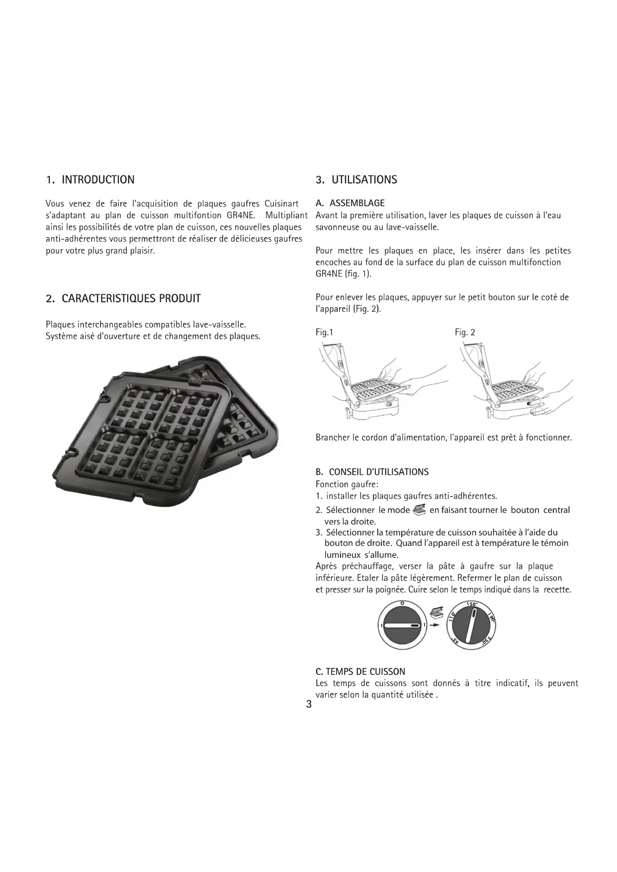 A. ASSEMBLAGE Avant la première utilisation, laver les plaques de cuisson à l’eau savonneuse ou au lave-vaisselle. Pour mettre les plaques en place, les insérer dans les petites encoches au fond de la surface du plan de cuisson multifonction GR4NE (fig. 1). Pour enlever les plaques, appuyer sur le petit bouton sur le coté de l’appareil (Fig. 2). Fig.1 Fig. 2 Brancher le cordon d’alimentation, l’appareil est prêt à fonctionner.