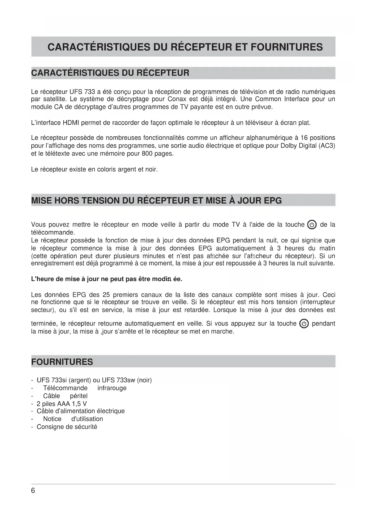 Caractéristiques du récepteur et fournitures.... 6