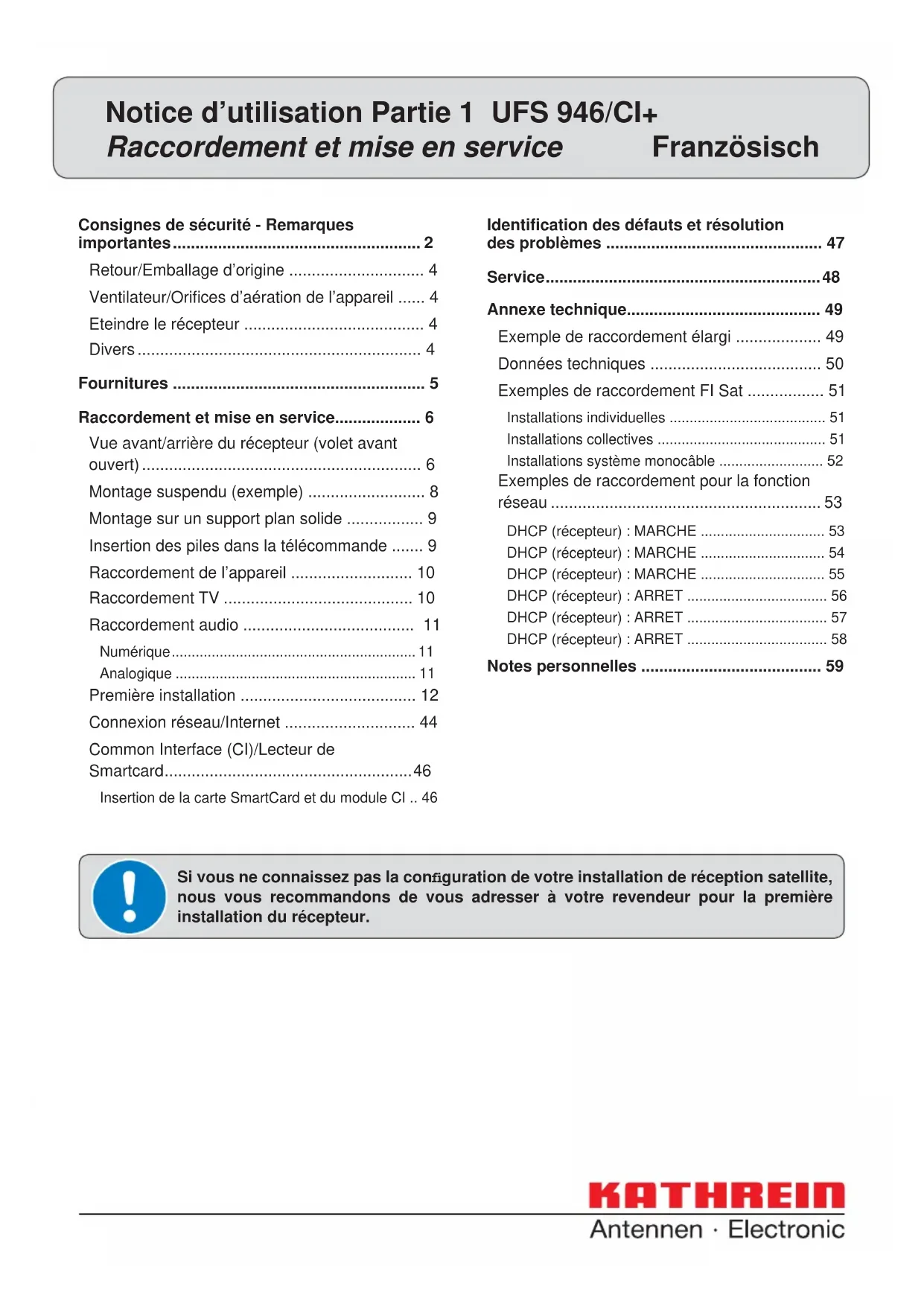 Si vous ne connaissiez pas la configuration de votre installation de réception satellite, nous vous recommendons de vous adresser à votre revendeur pour la première installation du récepteur.