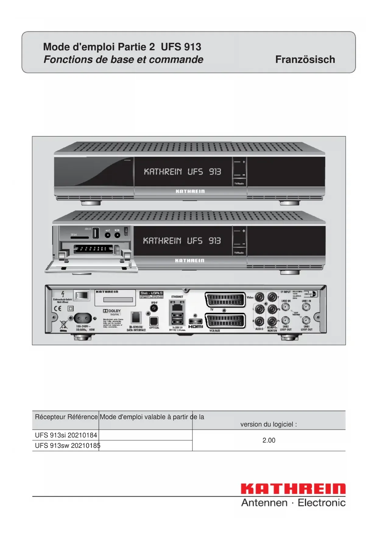 Mode d'emploi Partie 2 UFS 913 Fonctions de base et commande Französisch Récepteur Référence Mode d'emploi valable à partir de la version du logiciel : UFS 913si 20210184