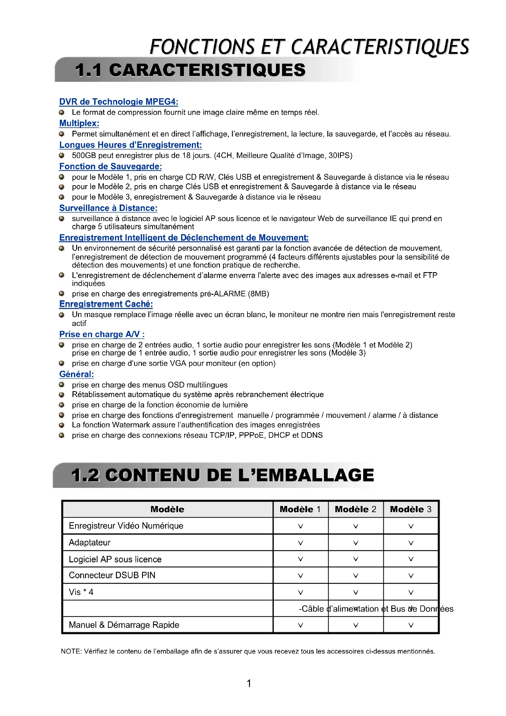 ral: ral: prise en charge des menus OSD multilingues Rétablissement automatique du système après rebranchement électrique prise en charge de la fonction économie de lumière prise en charge des fonctions d'enregistrement manuelle / programmée / mouvement / alarme / à distance La fonction Watermark assure l’authentification des images enregistrées prise en charge des connexions réseau TCP/IP, PPPoE, DHCP et DDNS NOTE: Vérifiez le contenu de l’emballage afin de s’assurer que vous recevez tous les accessoires ci-dessus mentionnés.