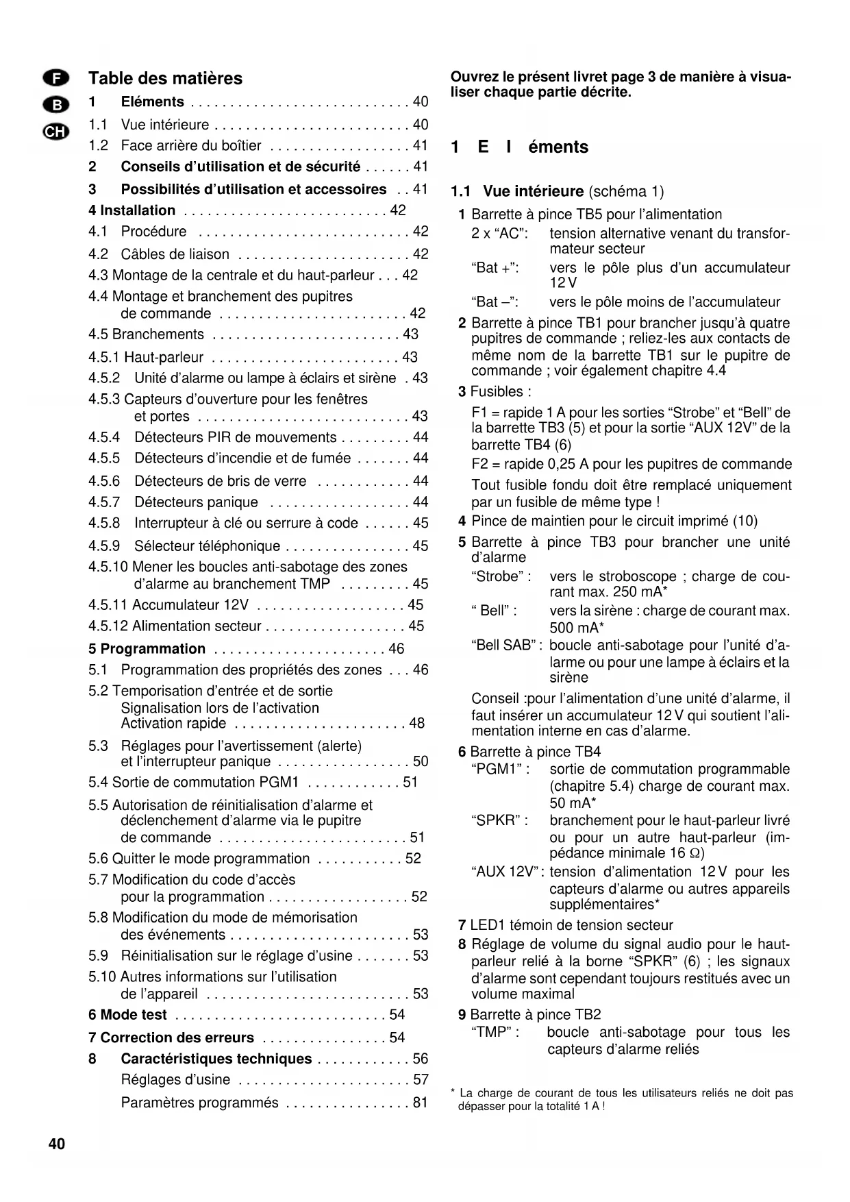 - V, max. 50 mA Par pupitre de commande : V, max. 40 mA En cas d’alarme : dépend des émetteurs de signal reliés Fusible coupure courant : p. 12