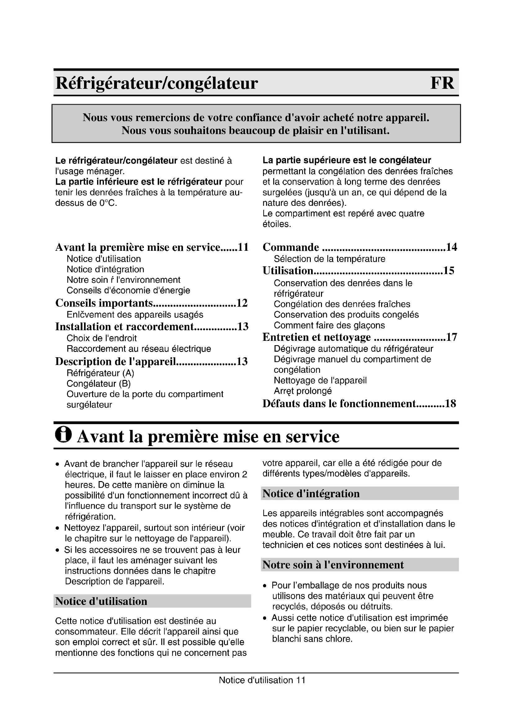 - Notice d'utilisation 11 Réfrigérateur/congélateur FR Nous vous remercions de votre confiance d'avoir acheté notre appareil. Nous vous souhaitons beaucoup de plaisir en l'utilisant. Le réfrigérateur/congélateur est destiné à l'usage ménager. La partie inférieure est le réfrigérateur pour tenir les denrées fraîches à la température au- dessus de 0°C. La partie supérieure est le congélateur permettant la congélation des denrées fraîches et la conservation à long terme des denrées surgelées (jusqu'à un an, ce qui dépend de la nature des denrées). Le compartiment est repéré avec quatre étoiles. Avant la première mise en service p. 11