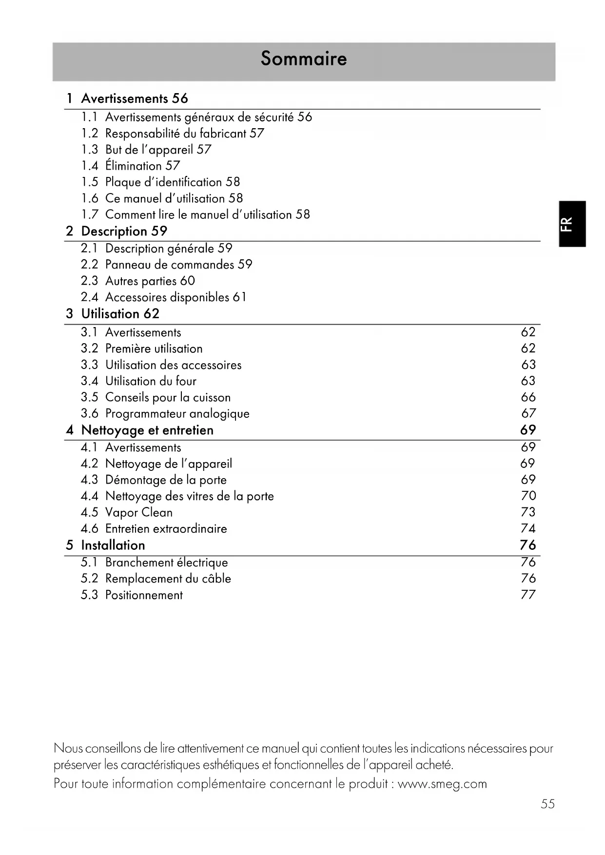 Nous conseillons de lire attentivement ce manuel qui contient toutes les indications nécessaires pour préserver les caractéristiques esthétiques et fonctionnelles de l’appareil acheté. Pour toute information complémentaire concernant le produit : www.smeg.comAvertissements