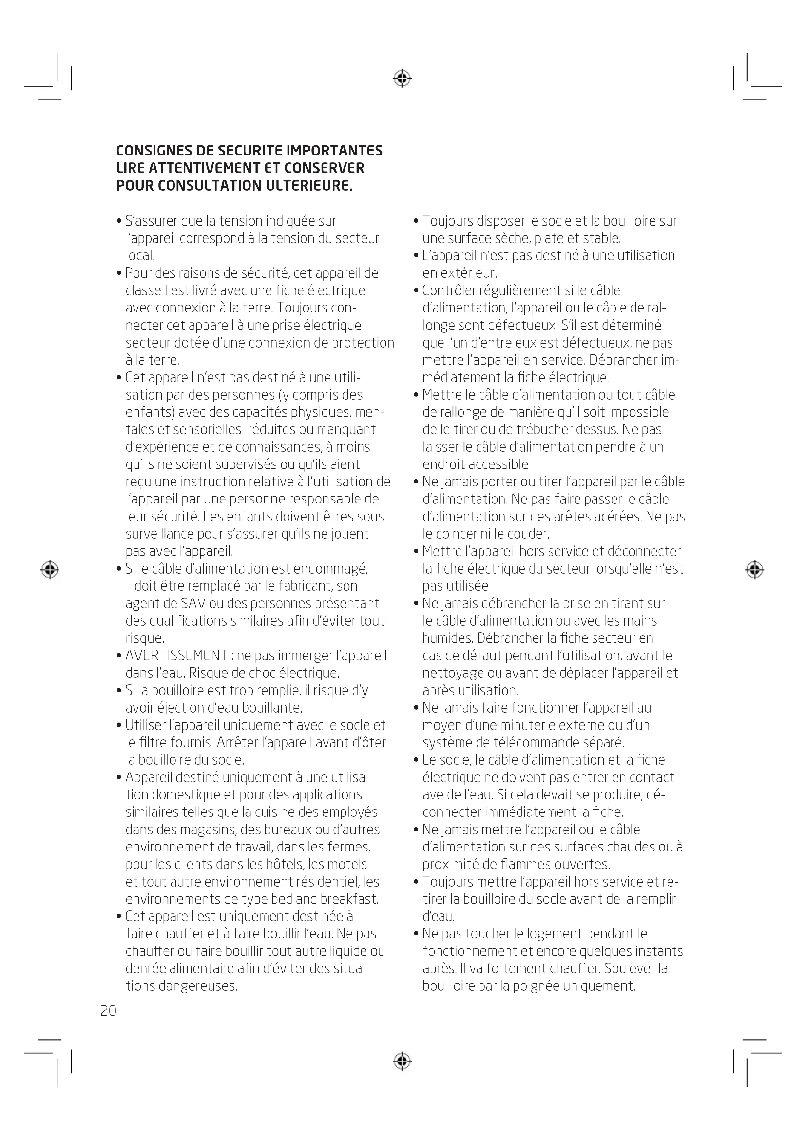 - Cet appareil est uniquement destinée à faire chauer et à faire bouillir l’eau. Ne pas chauer ou faire bouillir tout autre liquide ou denrée alimentaire an d’éviter des situa- tions dangereuses.