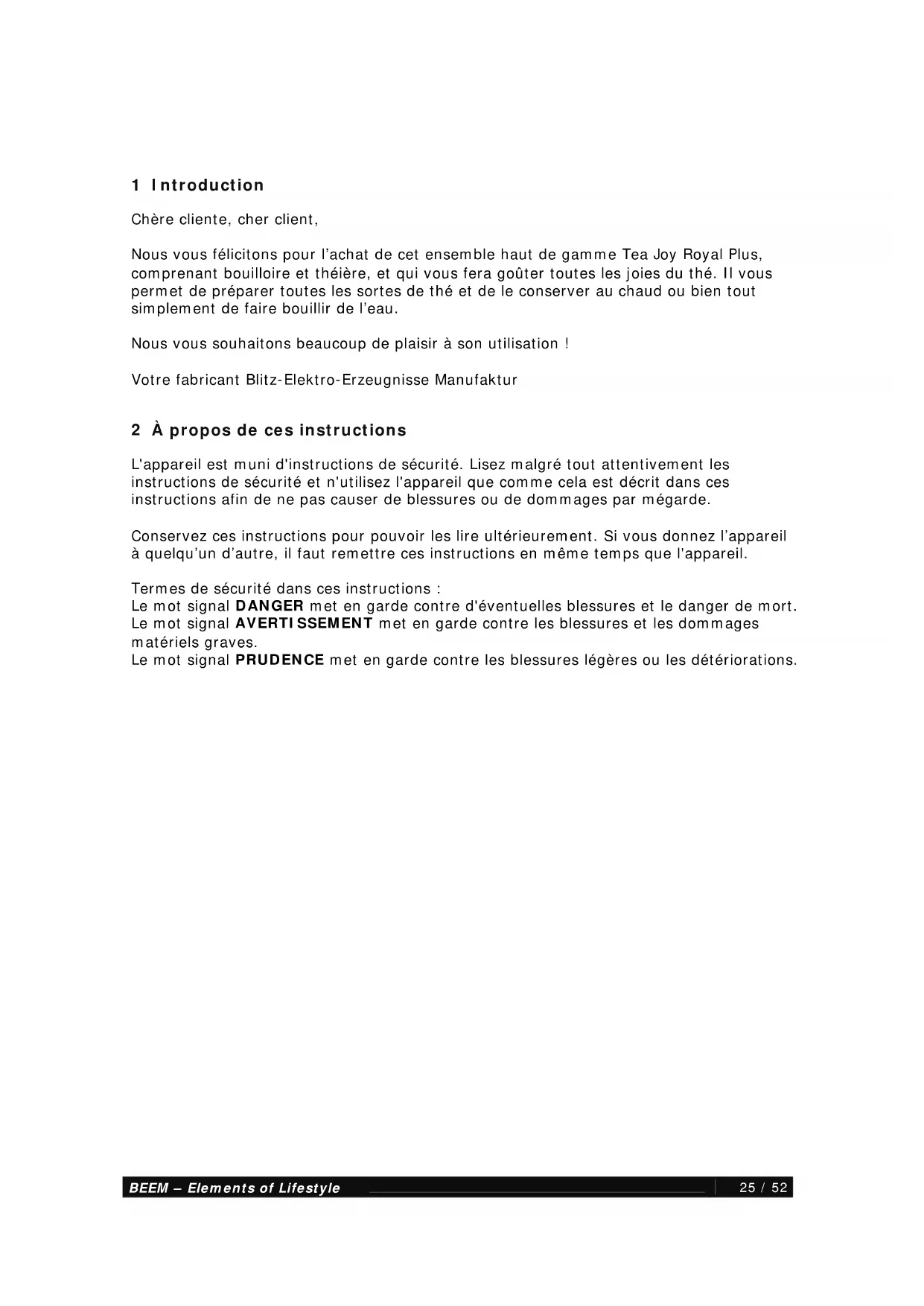 1 Introduction Chère cliente, cher client, Nous vous félicitons pour l’achat de cet ensemble haut de gamme Tea Joy Royal Plus, comprenant bouilloire et théière, et qui vous fera goûter toutes les joies du thé. Il vous permet de préparer toutes les sortes de thé et de le conserver au chaud ou bien tout simplement de faire bouillir de l’eau. Nous vous souhaitons beaucoup de plaisir à son utilisation ! Votre fabricant Blitz-Elektro-Erzeugnisse Manufaktur 2 À propos de ces instructions L'appareil est muni d'instructions de sécurité. Lisez malgré tout attentivement les instructions de sécurité et n'utilisez l'appareil que comme cela est décrit dans ces instructions afin de ne pas causer de blessures ou de dommages par mégarde. Conservez ces instructions pour pouvoir les lire ultérieurement. Si vous donnez l’appareil à quelqu’un d’autre, il faut remettre ces instructions en même temps que l'appareil. Termes de sécurité dans ces instructions : Le mot signal DANGER met en garde contre d'éventuelles blessures et le danger de mort. Le mot signal AVERTISSEMENT met en garde contre les blessures et les dommages matériels graves. Le mot signal PRUDENCE met en garde contre les blessures légères ou les détériorations.BEEM – Elements of Lifestyle 26 / 52