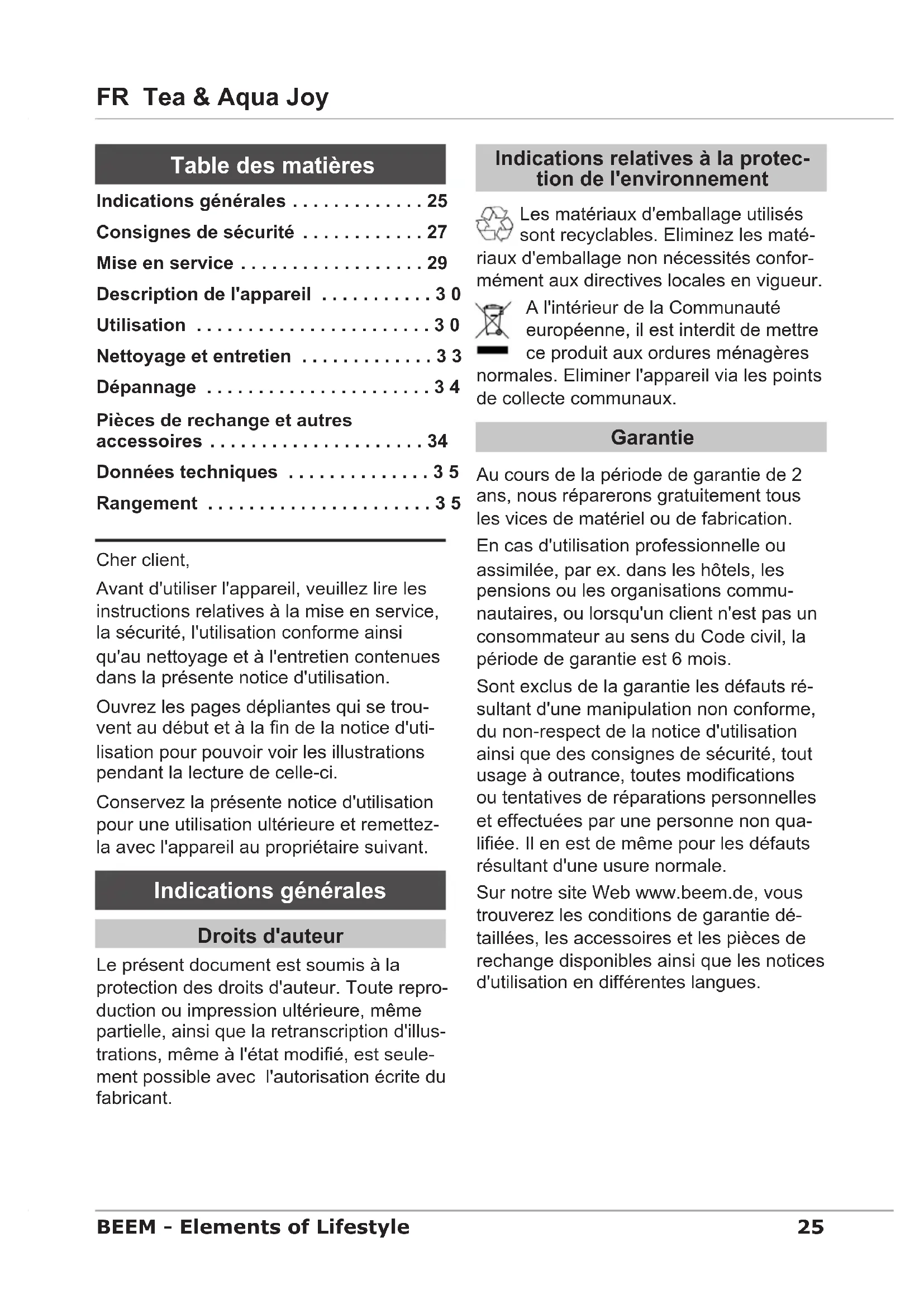 - according to the drawing in the description of the appliance24 Tea & Aqua Joy EN BEEM - Elements of Lifestyle Technical data Model Samowar / kettle & tea maker Tea & Aqua Joy Type number W12.001 Water tank capacity 1.5 l Teapot capacity 0.7 l Operating voltage 220-240 V AC Mains frequency 50 Hz Power consumption 1580-1880 W / 80 W Dimensions (H x W x D) 50 x 40 x 41 cm Approximate weight 1.4 kg Protection class I Storage If you do not intend to use the appliance for a longer period of time, empty and clean it as described in the section Clean- ing and care. Store the appliance in a dry, clean and frost-free place which is pro- tected against direct sunlight.25 fR Tea & Aqua Joy BEEM - Elements of Lifestyle Cher client, Avant d'utiliser l'appareil, veuillez lire les instructions relatives à la mise en service, la sécurité, l'utilisation conforme ainsi qu'au nettoyage et à l'entretien contenues dans la présente notice d'utilisation. Ouvrez les pages dépliantes qui se trou- vent au début et à la n de la notice d'uti- lisation pour pouvoir voir les illustrations pendant la lecture de celle-ci. Conservez la présente notice d'utilisation pour une utilisation ultérieure et remettez- la avec l'appareil au propriétaire suivant. Indications générales Droits d'auteur Le présent document est soumis à la protection des droits d'auteur. Toute repro- duction ou impression ultérieure, même partielle, ainsi que la retranscription d'illus- trations, même à l'état modié, est seule- ment possible avec l'autorisation écrite du fabricant. Indications relatives à la protec- tion de l'environnement Les matériaux d'emballage utilisés sont recyclables. Eliminez les maté- riaux d'emballage non nécessités confor- mément aux directives locales en vigueur. A l'intérieur de la Communauté européenne, il est interdit de mettre ce produit aux ordures ménagères normales. Eliminer l'appareil via les points de collecte communaux. Garantie Au cours de la période de garantie de 2 ans, nous réparerons gratuitement tous les vices de matériel ou de fabrication. En cas d'utilisation professionnelle ou assimilée, par ex. dans les hôtels, les pensions ou les organisations commu- nautaires, ou lorsqu'un client n'est pas un consommateur au sens du Code civil, la période de garantie est 6 mois. Sont exclus de la garantie les défauts ré- sultant d'une manipulation non conforme, du non-respect de la notice d'utilisation ainsi que des consignes de sécurité, tout usage à outrance, toutes modications ou tentatives de réparations personnelles et effectuées par une personne non qua- liée. Il en est de même pour les défauts résultant d'une usure normale. Sur notre site Web www.beem.de, vous trouverez les conditions de garantie dé- taillées, les accessoires et les pièces de rechange disponibles ainsi que les notices d'utilisation en différentes langues. Indications générales . . . . . . . . . . . . . 25 Consignes de sécurité . . . . . . . . . . . . 27 Mise en service . . . . . . . . . . . . . . . . . . 29 Description de l'appareil ...........30 Utilisation .......................30 Nettoyage et entretien .............33 Dépannage ......................34 Pièces de rechange et autres accessoires . . . . . . . . . . . . . . . . . . . . . 34 Données techniques ..............35 Rangement ......................35 Table des matières26 Tea & Aqua Joy FR BEEM - Elements of Lifestyle AVERTISSEMENT En cas d'utilisation non conforme et/ ou autre, l'appareil peut présenter des dangers. L'appareil doit uniquement être ► utilisé de manière conforme. Respecter les procédures décrites ► dans la présente notice d'utilisation. Toutes réclamations pour cause de dom- mages survenus suite à une utilisation non conforme sont exclues. Seul l'utilisateur en assume les risques. En cas d'utilisation à titre commercial, veuillez noter la modication de la période de garantie. Limites de responsabilité Toutes les informations techniques, don- nées et indications gurant dans la pré- sente notice d'utilisation correspondent à l'état le plus récent des connaissances lors de l'impression. Les indications, illustrations et descriptions de la présente notice ne peuvent donner lieu à aucune revendication de quelque type que ce soit. Le fabricant décline toute responsabilité pour les dommages survenus en cas de non-respect de la présente notice, d'utili- sation non conforme, de réparations inap- propriées, de modications non autorisées ou d'utilisation de pièces de rechange et/ ou de consommables interdits.Sécurité Déclaration de conformité Par la présente, la société BEEM déclare que l'appareil est conforme aux exigences fondamentales et autres des directives 2006/95/CE et 2004/108/CE. Vous trou- verez une déclaration de conformité com- plète sous www.beem.de. Symboles utilisés DANGER Est utilisé pour un danger imminent et menaçant pouvant occasionner des blessures graves voire mortelles. Pour prévenir à ce risque, suivez les ► instructions indiquées ici. AVERTISSEMENT Est utilisé pour une situation potentielle- ment dangereuse pouvant occasionner des blessures graves ou mortelles. Pour prévenir à ce risque, suivez les ► instructions indiquées ici. ATTENTION Est utilisé pour une situation potentielle- ment dangereuse pouvant occasionner des blessures légères ou des domma- ges matériels. Pour prévenir à ce risque, suivez les ► instructions indiquées ici. INDICATION Une indication désigne les informa- ► tions supplémentaires facilitant le maniement de l'appareil. Utilisation conforme Cet appareil est exclusivement prévu pour l'utilisation à caractère non commercial dans des locaux fermés pour réchauffer de l'eau et du thé. Toute autre utilisation ou toute utilisation allant au-delà de celle-ci est considérée comme non conforme.27 fR Tea & Aqua Joy BEEM - Elements of Lifestyle Consignes de sécurité Avant d'utiliser l'appareil, veuillez le 
