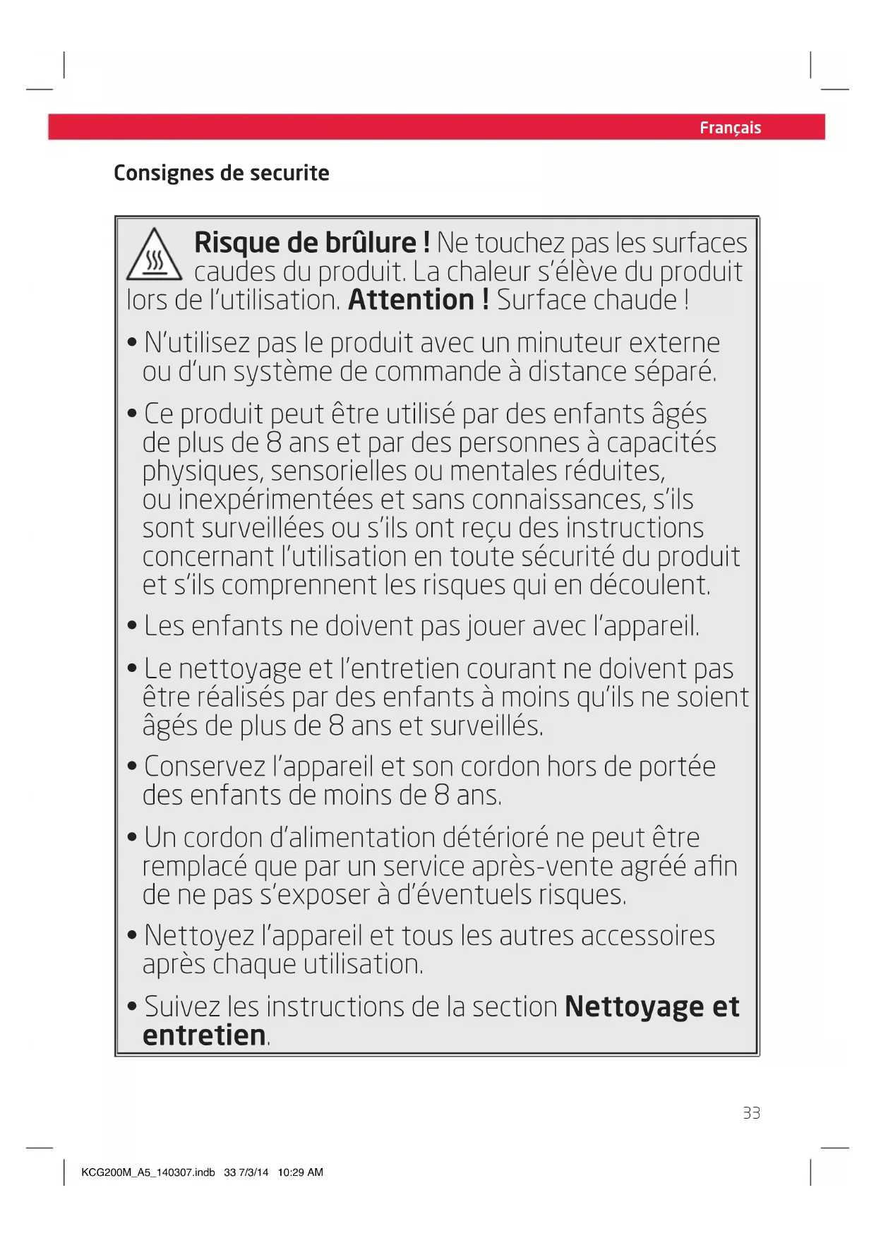 - Le nettoyage et l'entretien courant ne doit pas être réalisés par des enfants à moins qu'ils ne soient âgés de plus de 8 ans et surveillés.