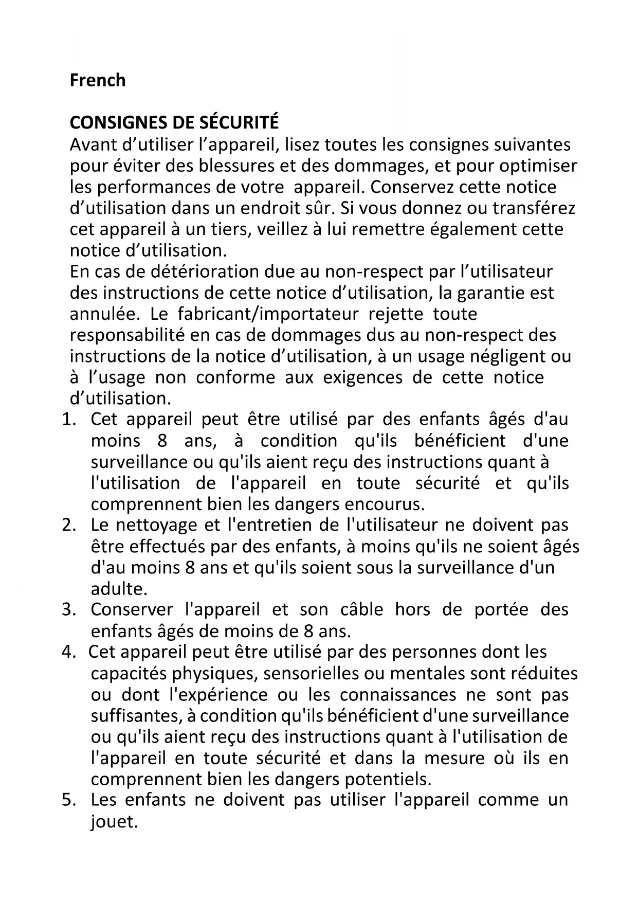 Avant d’utiliser l’appareil, lisez toutes les consignes suivantes pour éviter des blessures et des dommages, et pour optimiser les performances de votre appareil. Conservez cette notice d’utilisation dans un endroit sûr. Si vous donnez ou transférez cet appareil à un tiers, veillez à lui remettre également cette notice d’utilisation. En cas de détérioration due au non-respect par l’utilisateur des instructions de cette notice d’utilisation, la garantie est annulée. Le fabricant/importateur rejette toute responsabilité en cas de dommages dus au non-respect des instructions de la notice d’utilisation, à un usage négligent ou à l’usage non conforme aux exigences de cette notice d’utilisation.