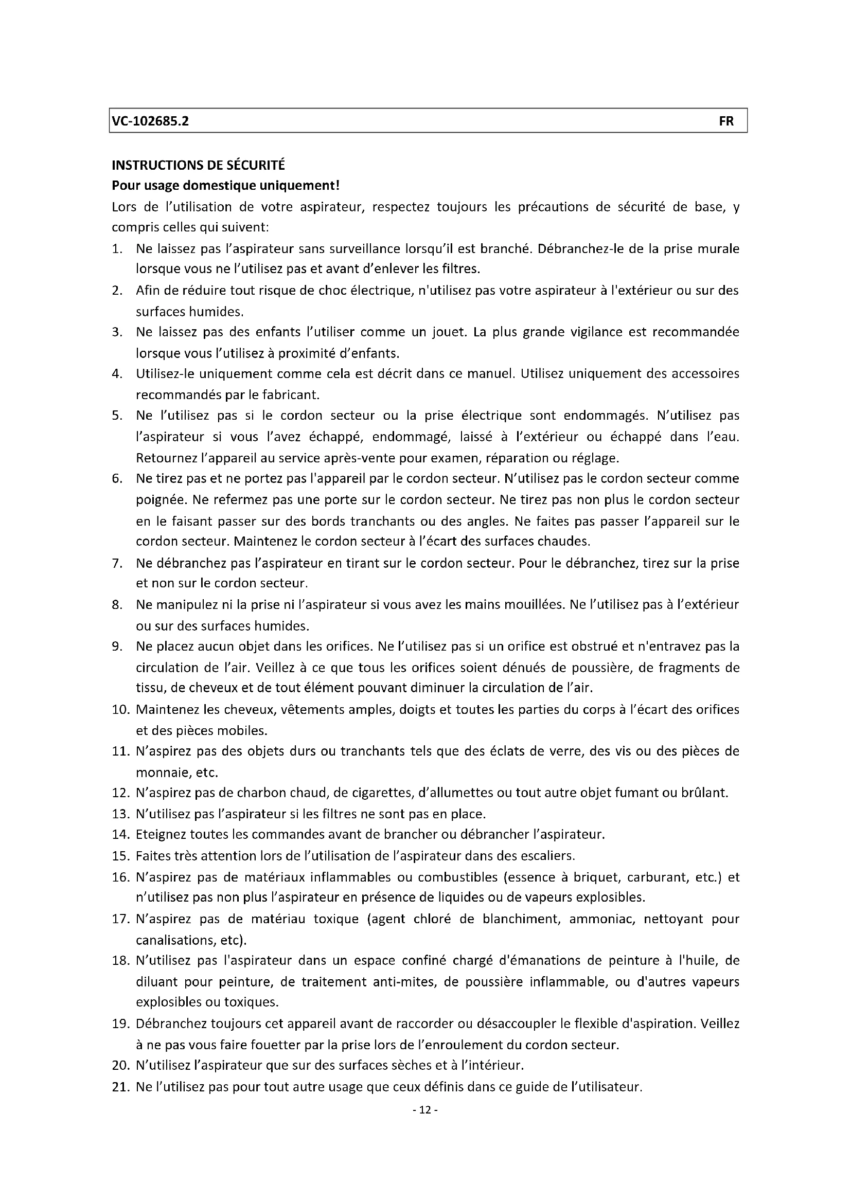 INSTRUCTIONSDESÉCURITÉ Pourusagedomestiqueuniquement! Lors de l’utilisation de votre aspirateur, respectez toujours les précautions de sécurité de base, y compriscellesquisuivent:
