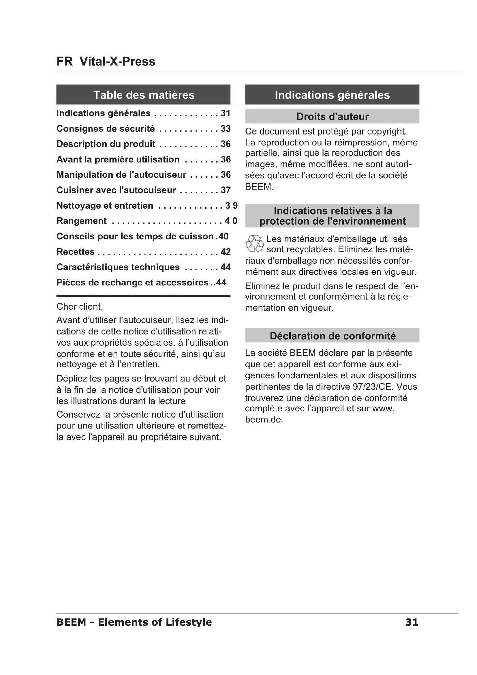 - numbering according to the description of the appliance31 FR Vital-X-Press BEEM - Elements of Lifestyle Cher client, Avant d’utiliser l’autocuiseur, lisez les indi- cations de cette notice d'utilisation relati- ves aux propriétés spéciales, à l’utilisation conforme et en toute sécurité, ainsi qu’au nettoyage et à l’entretien. Dépliez les pages se trouvant au début et à la n de la notice d'utilisation pour voir les illustrations durant la lecture Conservez la présente notice d'utilisation pour une utilisation ultérieure et remettez- la avec l'appareil au propriétaire suivant. Indications générales Droits d'auteur Ce document est protégé par copyright. La reproduction ou la réimpression, même partielle, ainsi que la reproduction des images, même modiées, ne sont autori- sées qu’avec l’accord écrit de la société BEEM. Indications relatives à la protection de l'environnement Les matériaux d'emballage utilisés sont recyclables. Eliminez les maté- riaux d'emballage non nécessités confor- mément aux directives locales en vigueur. Eliminez le produit dans le respect de l’en- vironnement et conformément à la régle- mentation en vigueur. Déclaration de conformité La société BEEM déclare par la présente que cet appareil est conforme aux exi- gences fondamentales et aux dispositions pertinentes de la directive 97/23/CE. Vous trouverez une déclaration de conformité complète avec l’appareil et sur www. beem.de. Indications générales . . . . . . . . . . . . . 31 Consignes de sécurité . . . . . . . . . . . . 33 Description du produit . . . . . . . . . . . . 36 Avant la première utilisation . . . . . . . 36 Manipulation de l'autocuiseur . . . . . . 36 Cuisiner avec l'autocuiseur . . . . . . . . 37 Nettoyage et entretien .............39 Rangement ......................40 Conseils pour les temps de cuisson . 40 Recettes . . . . . . . . . . . . . . . . . . . . . . . . 42 Caractéristiques techniques . . . . . . . 44 Pièces de rechange et accessoires . . 44 Table des matières32 Vital-X-Press FR BEEM - Elements of Lifestyle ATTENTION Est utilisé pour une situation potentielle- ment dangereuse pouvant occasionner des blessures légères ou des domma- ges matériels. Pour prévenir à ce risque, suivez les ► instructions indiquées ici. INDICATION Une indication désigne les informa- ► tions supplémentaires facilitant le maniement de l'appareil. Utilisation conforme Ce produit est destiné à une utilisation non commerciale pour préparer des plats sur des plaques électriques, à gaz ou à induction. Toute autre utilisation au-delà de celle-ci est considérée comme non conforme. AVERTISSEMENT En cas d'utilisation non conforme et/ou autre, l'appareil peut présenter des dangers. L'appareil doit uniquement être ► utilisé de manière conforme. Respecter les procédures décrites ► dans la présente notice d'utilisation. Toutes réclamations pour cause de dom- mages survenus suite à une utilisation non conforme sont exclues. Seul l'utilisateur en assume les risques. Garantie Outre l’obligation de garantie légale, BEEM accorde une garantie fabricant étendue sur certains produits. Si elle est octroyée, vous trouverez les informations correspondantes soit sur l’emballage du produit en question, sur sa documentation promotionnelle ou sur le site Internet de BEEM Sur notre site Internet www.beem.de, vous trouverez les conditions de garantie détaillées, les accessoires et les pièces de rechange disponibles ainsi que les notices d’utilisation en différentes langues. Symboles utilisés DANGER Est utilisé pour une situation potentielle- ment dangereuse pouvant occasionner des blessures graves ou mortelles. Pour prévenir à ce risque, suivez les ► instructions indiquées ici. AVERTISSEMENT Est utilisé pour une situation potentielle- ment dangereuse pouvant entraîner des blessures corporelles. Pour prévenir à ce risque, suivez les ► instructions indiquées ici.33 FR Vital-X-Press BEEM - Elements of Lifestyle Limites de responsabilité Nous n’assumons aucune responsabilité pour les dégâts ou dommages consécutifs en cas de : non-respect de la notice d’utilisation ; ■ utilisation non-conforme ; ■ manipulation non-conforme ou incor- ■ recte ; réparations effectuées de manière ■ inappropriée ; modications non-autorisées ■ utilisation de pièces et pièces de re- ■ change autres que celles du fabricant ; utilisation d’accessoires ou de pièces ■ complémentaires inappropriées. Consignes de sécurité Consignes de sécurité générales Lire attentivement cette notice ► d'utilisation et toutes les instructions qu’il contient avant de travailler avec l’autocuiseur. Une utilisation non conforme peut entraîner des domma- ges importants. Ne pas laisser l’autocuiseur à une ► personne n’étant pas familiarisée avec le mode d’emploi. Transmettre l’autocuiseur à un tiers ► uniquement accompagné du mode d’emploi. DANGER Risque d’étouffement avec les maté- riaux d’emballage! Les matériaux d'emballage ne doi- ► vent pas être utilisés pour jouer. Il y a risque d'étouffement. Surveillance Ne pas laisser l’autocuiseur sans sur- ► veillance lors de son utilisation. Ne pas utiliser l’autocuiseur à proxi- ► mité d’enfants. Cet autocuiseur ne doit pas être utilisé ► par des personnes (y compris des enfants) possédant des capacités phy- siques, sensorielles ou intellectuelles limitées ou manquant d’expérience et/ ou de connaissances, sauf si elles sont sous la surveillance d’une personne responsable de leur sécurité ou leur donnant des instructions pour utiliser l’appareil. Utilisation conforme AVERTISSEMENT Pour éviter tous dommages corporels, veuillez respecter les consignes suivantes : L’autocuiseur cuit sous pression. ► Avant de chauffer, vériez toujours le bon positionnement du couvercle, comme décrit au chapitre Fermer le couvercle (p. 3