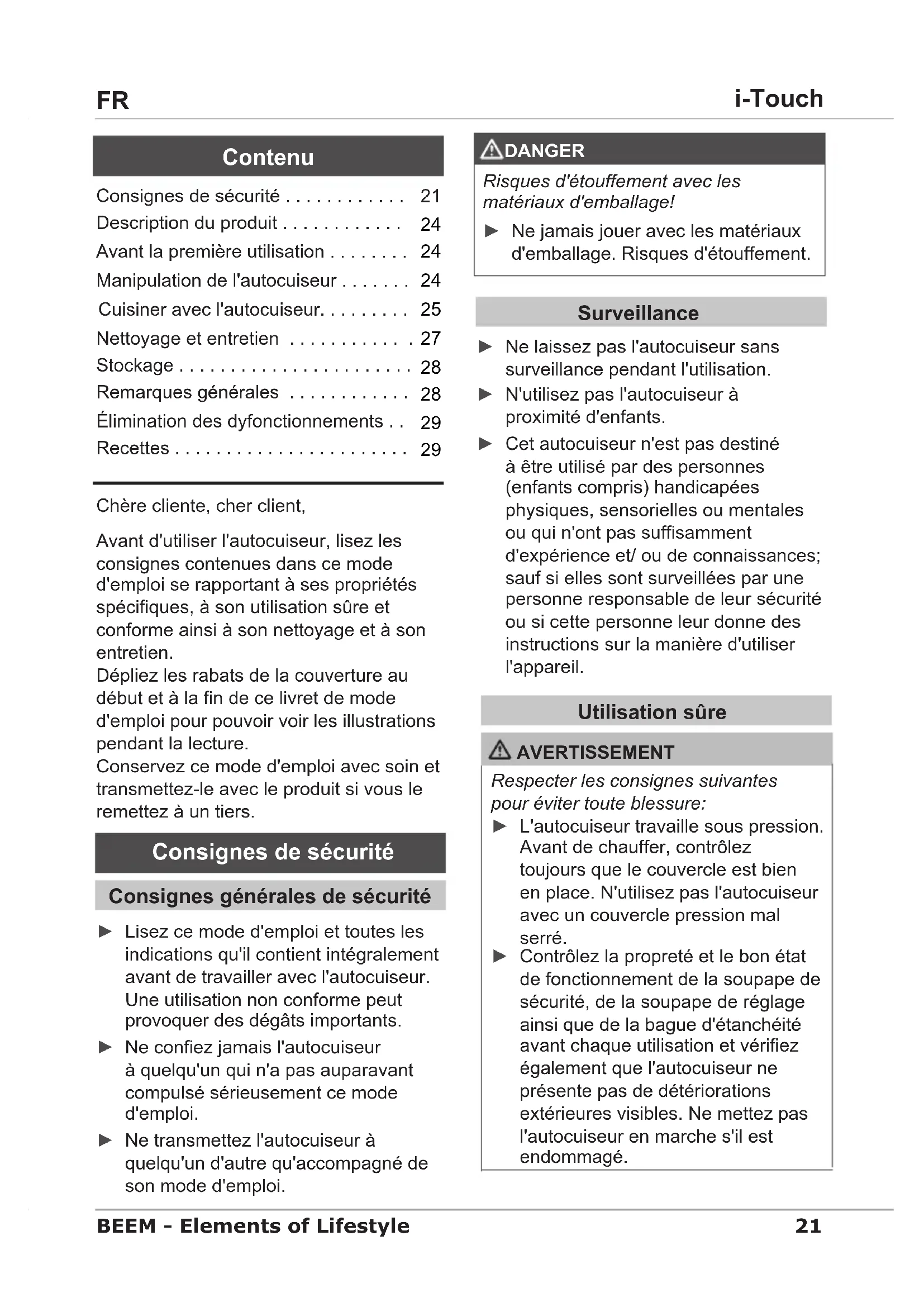 i-Touch BEEM - Elements of Lifestyle Chère cliente, cher client, Avant d'utiliser l'autocuiseur, lisez les consignes contenues dans ce mode d'emploi se rapportant à ses propriétés spécifiques, à son utilisation sûre et conforme ainsi à son nettoyage et à son entretien. Dépliez les rabats de la couverture au début et à la fin de ce livret de mode d'emploi pour pouvoir voir les illustrations pendant la lecture. Conservez ce mode d'emploi avec soin et transmettez-le avec le produit si vous le remettez à un tiers. Consignes de sécurité Consignes générales de sécurité