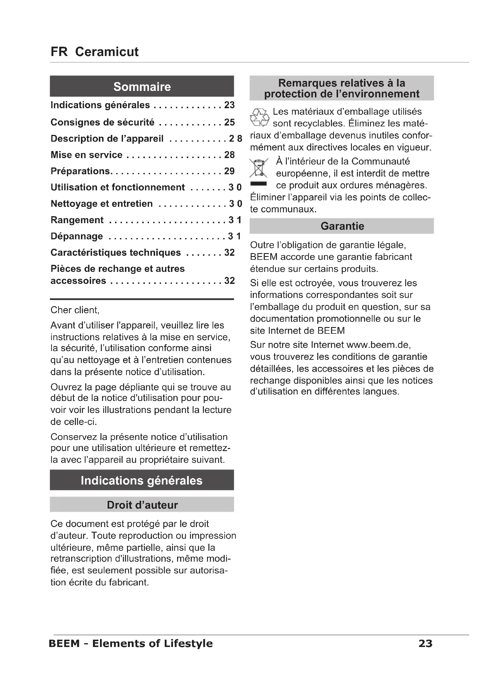 Sur notre site Internet www.beem.de, vous trouvez les conditions de garantie détaillées, les accessoires et les pièces de rechange disponibles ainsi que les notices d'utilisation en différentes langues.