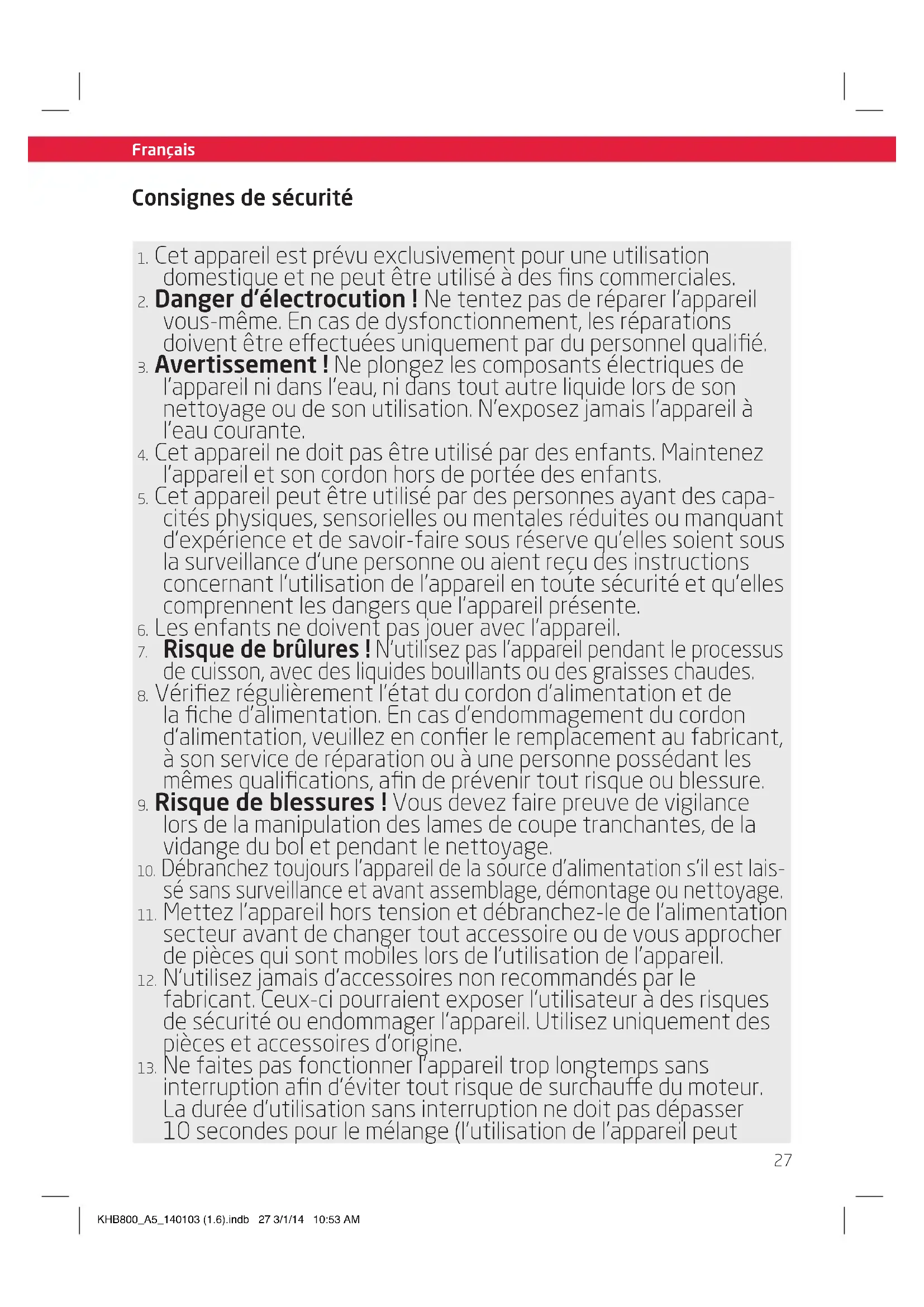interruption afin d’éviter tout risque de surchaue du moteur. La durée d’utilisation sans interruption ne doit pas dépasser 10 secondes pour le mélange (l’utilisation de l’appareil peut KHB800_A5_140103 (1.6).indb 27 3/1/14 10:53 AM28 Français Français Consignes de sécurité