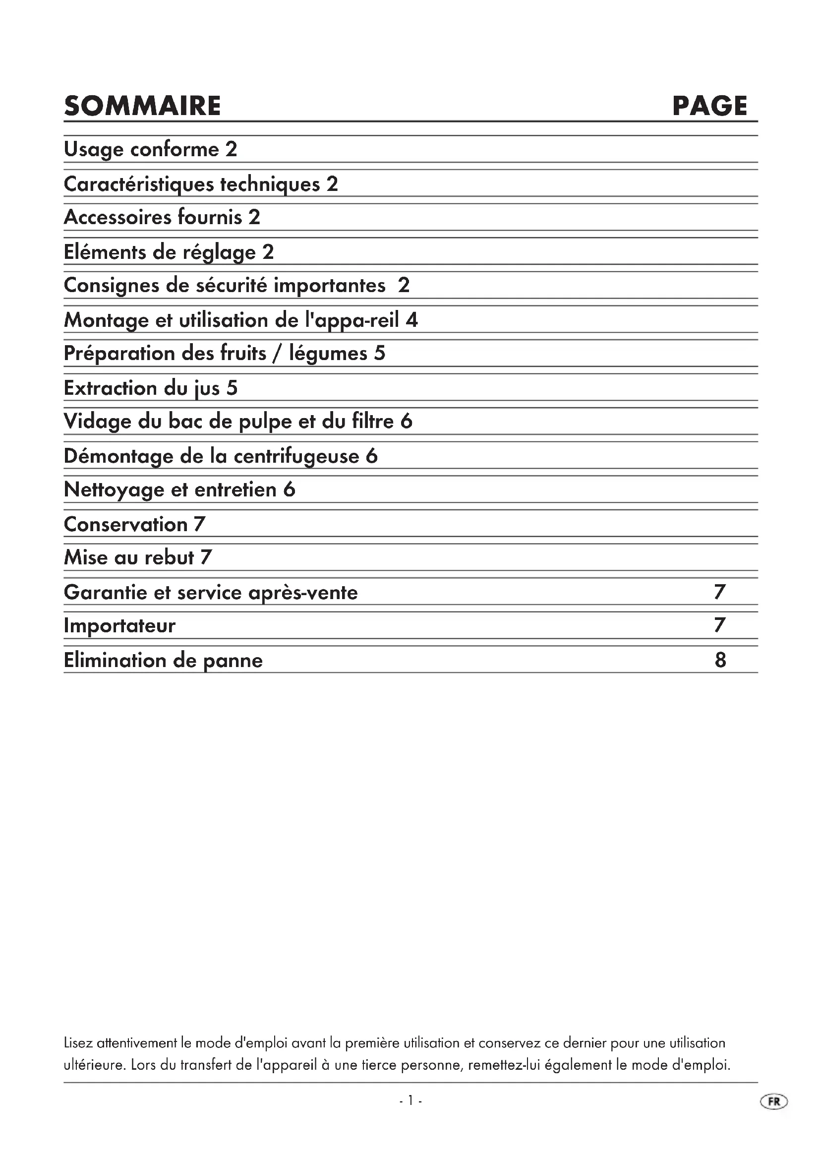 KH 451 CV_KH451_E25849_LB2.qxd 08.01.2009 9:48 Uhr Seite 4- 1 - SOMMAIRE PAGE Usage conforme 2 Caractéristiques techniques 2 Accessoires fournis 2 Eléments de réglage 2 Consignes de sécurité importantes 2 Montage et utilisation de l'appa-reil 4 Préparation des fruits / légumes 5 Extraction du jus 5 Vidage du bac de pulpe et du filtre 6 Démontage de la centrifugeuse 6 Nettoyage et entretien 6 Conservation 7 Mise au rebut 7 Garantie et service après-vente 7 Importateur 7 Elimination de panne 8 Lisez attentivement le mode d'emploi avant la première utilisation et conservez ce dernier pour une utilisation ultérieure. Lors du transfert de l'appareil à une tierce personne, remettez-lui également le mode d'emploi. IB_KH451_E25849_LB2 21.01.2009 10:25 Uhr Seite 1- 2 - CENTRIFUGEUSE KH 451 Usage conforme L'appareil est destiné à l'extraction du jus des fruits et des légumes mûrs et épluchés. L'appareil ne doit être utilisé qu'avec des produits alimentaires. Seuls des accessoires d'origine comme décrit dans ce mode d'emploi doivent être utilisés. Toute autre utilisation ou modification de l'appareil est considérée comme non conforme et comporte d'importants risques d'acci- dent. Le fabricant n'endosse aucune responsabilité pour des dommages causés résultant d'une utilisation non conforme. Non approprié pour une mise en appli- cation commerciale. Caractéristiques techniques Tension du secteur : 220 - 240 V