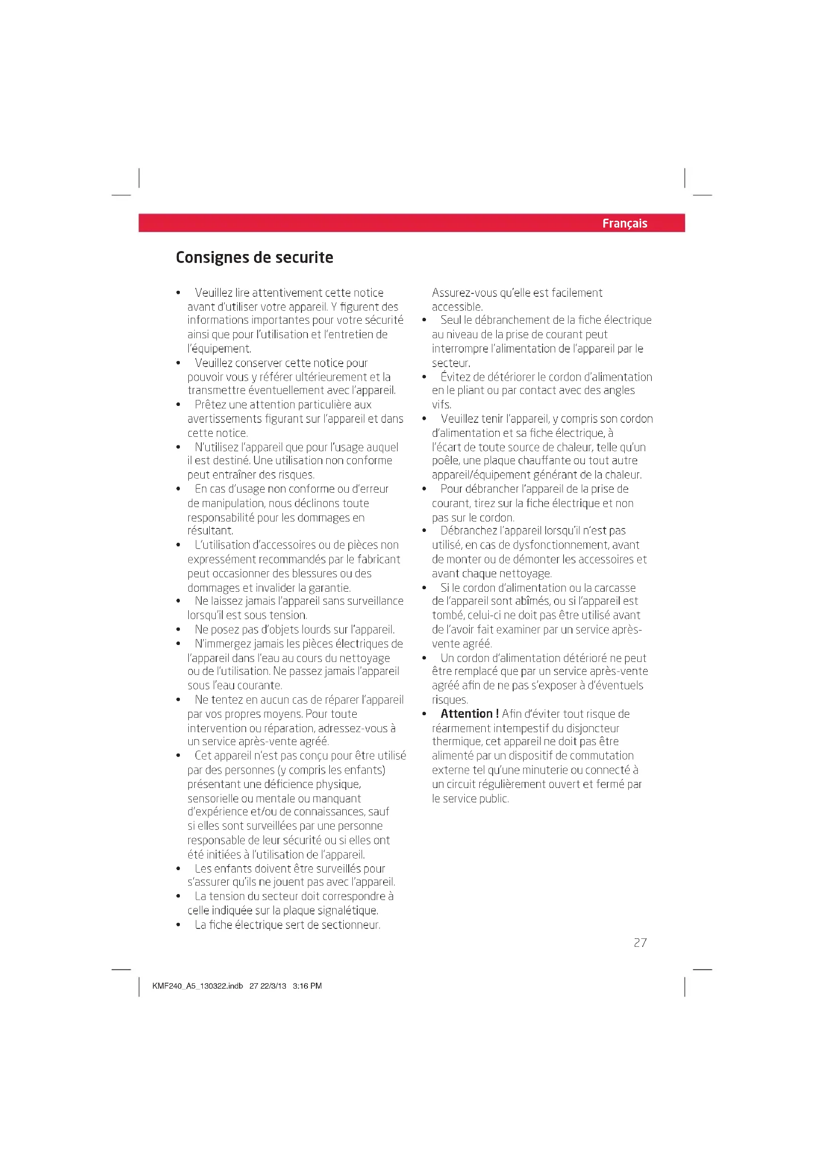 Œ Veuillez lire attentivement cette notice avant d’utiliser votre appareil. Y figurent des informations importantes pour votre sécurité ainsi que pour l’utilisation et l’entretien de l’équipement. Œ Veuillez conserver cette notice pour pouvoir vous y référer ultérieurement et la transmettre éventuellement avec l’appareil. Œ Prêtez une attention particulière aux avertissements figurant sur l’appareil et dans cette notice. Œ N’utilisez l’appareil que pour l’usage auquel il est destiné. Une utilisation non conforme peut entraîner des risques. Œ En cas d’usage non conforme ou d’erreur de manipulation, nous déclinons toute responsabilité pour les dommages en résultant. Œ L’utilisation d’accessoires ou de pièces non expressément recommandés par le fabricant peut occasionner des blessures ou des dommages et invalider la garantie. Œ Ne laissez jamais l’appareil sans surveillance lorsqu’il est sous tension. Œ Ne posez pas d’objets lourds sur l’appareil. Œ N’immergez jamais les pièces électriques de l’appareil dans l’eau au cours du nettoyage ou de l’utilisation. Ne passez jamais l’appareil sous l’eau courante. Œ Ne tentez en aucun cas de réparer l’appareil par vos propres moyens. Pour toute intervention ou réparation, adressez-vous à un service après-vente agréé. Œ Cet appareil n’est pas conçu pour être utilisé par des personnes (y compris les enfants) présentant une déficience physique, sensorielle ou mentale ou manquant d’expérience et/ou de connaissances, sauf si elles sont surveillées par une personne responsable de leur sécurité ou si elles ont été initiées à l’utilisation de l’appareil. Œ Les enfants doivent être surveillés pour s’assurer qu’ils ne jouent pas avec l’appareil. Œ La tension du secteur doit correspondre à celle indiquée sur la plaque signalétique. Œ La fiche électrique sert de sectionneur. Assurez-vous qu’elle est facilement accessible. Œ Seul le débranchement de la fiche électrique au niveau de la prise de courant peut interrompre l’alimentation de l’appareil par le secteur. Œ Évitez de détériorer le cordon d’alimentation en le pliant ou par contact avec des angles vifs. Œ Veuillez tenir l’appareil, y compris son cordon d’alimentation et sa fiche électrique, à l’écart de toute source de chaleur, telle qu’un poêle, une plaque chauante ou tout autre appareil/équipement générant de la chaleur. Œ Pour débrancher l’appareil de la prise de courant, tirez sur la fiche électrique et non pas sur le cordon. Œ Débranchez l’appareil lorsqu’il n’est pas utilisé, en cas de dysfonctionnement, avant de monter ou de démonter les accessoires et avant chaque nettoyage. Œ Si le cordon d’alimentation ou la carcasse de l’appareil sont abîmés, ou si l’appareil est tombé, celui-ci ne doit pas être utilisé avant de l’avoir fait examiner par un service après- vente agréé. Œ Un cordon d’alimentation détérioré ne peut être remplacé que par un service après-vente agréé afin de ne pas s’exposer à d’éventuels risques. Œ Attention ! Afin d’éviter tout risque de réarmement intempestif du disjoncteur thermique, cet appareil ne doit pas être alimenté par un dispositif de commutation externe tel qu’une minuterie ou connecté à un circuit régulièrement ouvert et fermé par le service public. Consignes de securite KMF240_A5_130322.indb 27 22/3/13 3:16 PMFrançais