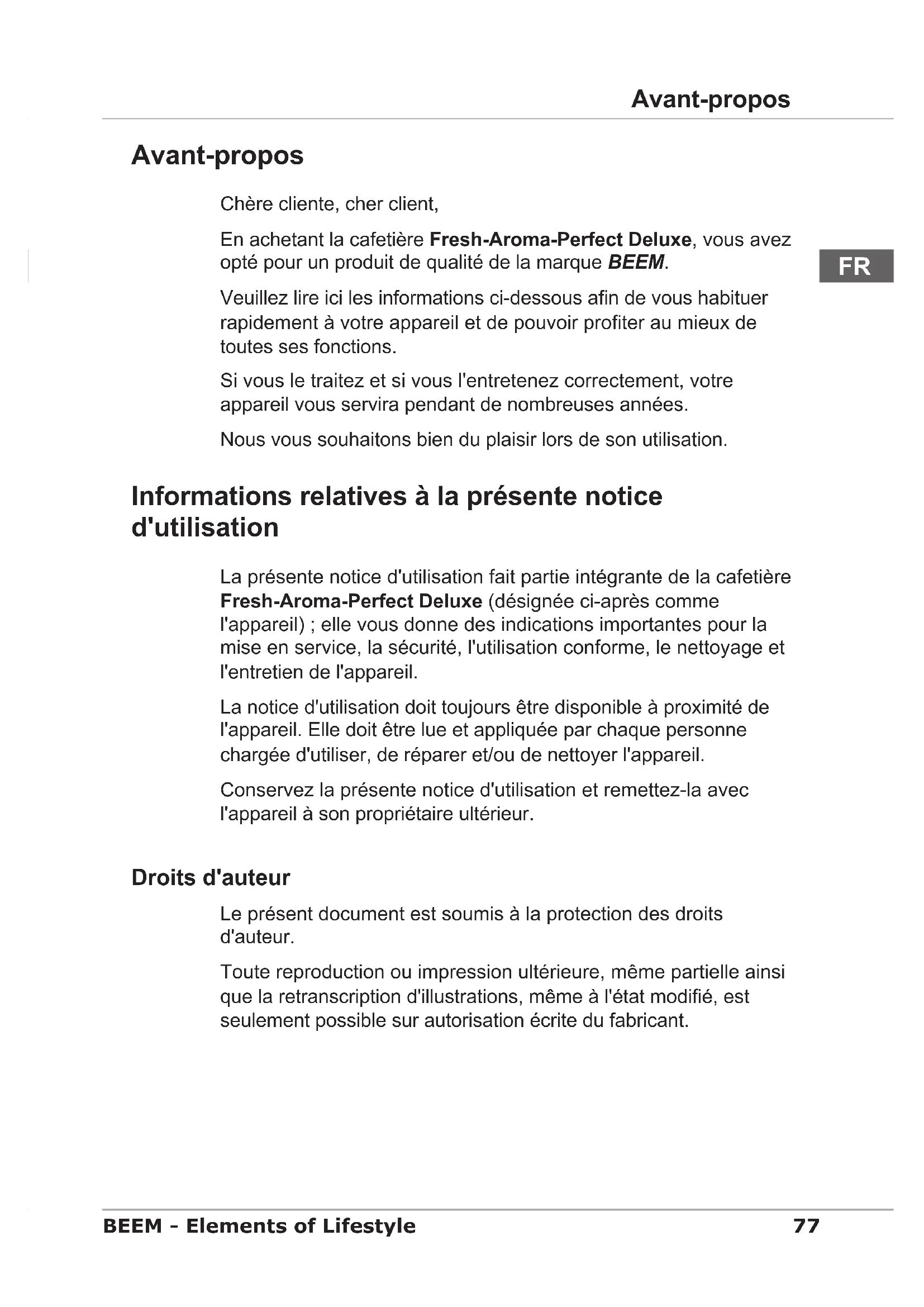 Avant-propos Chère cliente, cher client, En achetant la cafetière Fresh-Aroma-Perfect Deluxe, vous avez opté pour un produit de qualité de la marque BEEM. Veuillez lire ici les informations ci-dessous an de vous habituer rapidement à votre appareil et de pouvoir proter au mieux de toutes ses fonctions. Si vous le traitez et si vous l'entretenez correctement, votre appareil vous servira pendant de nombreuses années. Nous vous souhaitons bien du plaisir lors de son utilisation. Informations relatives à la présente notice d'utilisation La présente notice d'utilisation fait partie intégrante de la cafetière Fresh-Aroma-Perfect Deluxe (désignée ci-après comme l'appareil) ; elle vous donne des indications importantes pour la mise en service, la sécurité, l'utilisation conforme, le nettoyage et l'entretien de l'appareil. La notice d'utilisation doit toujours être disponible à proximité de l'appareil. Elle doit être lue et appliquée par chaque personne chargée d'utiliser, de réparer et/ou de nettoyer l'appareil. Conservez la présente notice d'utilisation et remettez-la avec l'appareil à son propriétaire ultérieur. Droits d'auteur Le présent document est soumis à la protection des droits d'auteur. Toute reproduction ou impression ultérieure, même partielle ainsi que la retranscription d'illustrations, même à l'état modié, est seulement possible sur autorisation écrite du fabricant.78 Informations relatives à la présente notice d'utilisation BEEM - Elements of Lifestyle
