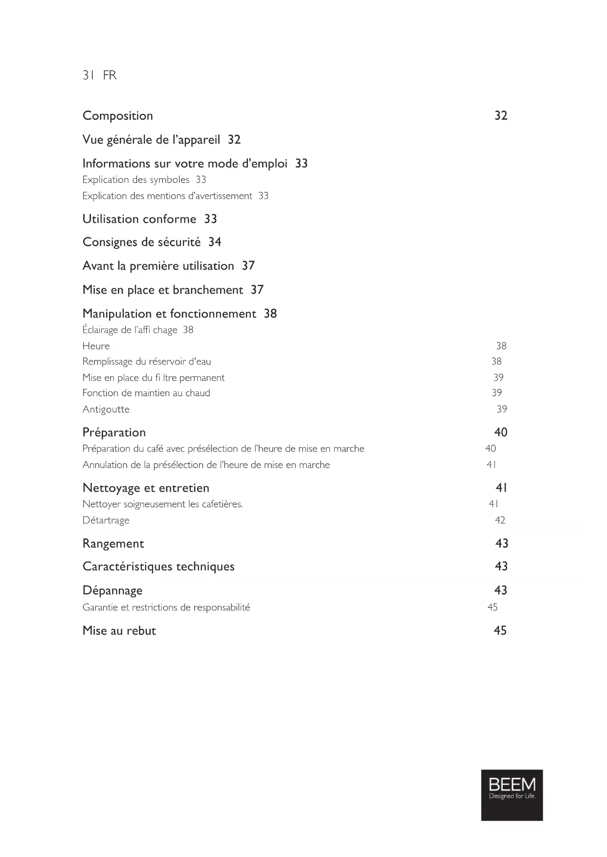 - Mode d'emploi Prière de s’assurer que l'ensemble livré est complet et ne présente pas de dommage imputable au transport. En cas d'endommagement de l'appareil ou du conduit de branchement, ne pas utiliser l'appareil. Contacter le service après-vente. Vue générale de l’appareil Légende (Illustrations sur le rabat) 1 Couvercle du réservoir d’eau 2 Filtre permanent 3 Compartiment à fi ltre 4 Antigoutte à l‘écoulement du café du compartiment à fi ltre 5 Cafetière en verre 6 Plaque de maintien au chaud 7 Panneau de commande avec affi chage et témoins lumineux 8 Repère de niveau d’eau 9 Réservoir d’eau Panneau de commande 10 Touche PROG (programmation de l’heure/ de la minuterie) 11 Témoin de fonctionnement, rouge 12 Touche MIN (réglage des minutes) 13 Touche ON / OFF (interrupteur marche/ arrêt) 14 Touche HR (réglage des heures) 15 Témoin lumineux de minuterie, vert 16 Touche AUTO (activation/ désactivation de la minuterie)33 FR Félicitations pour cet excellent choix! Chère cliente, cher client, Félicitations pour l’acquisition de cette machine à café fi ltre. Pour toute question concernant cet appareil et ses pièces de rechange et accessoires, prière de contacter le service après-vente à partir de notre site Internet: www.beem.de Informations sur votre mode d'emploi Prière de lire attentivement le présent mode d'emploi avant la première utilisation de l’appareil et de le conserver précieusement pour toute consultation ultérieure. En cas de prêt ou de don de cet appareil à une tierce personne, ne pas oublier d'y joindre ce mode d'emploi. Le fabricant et l'importateur déclinent toute responsabilité en cas de non-observation des instructions qu'il contient. Explication des symboles Symboles de danger: ces symboles signalent des risques de blessure. Prière de lire et d’observer attentivement les consignes de sécurité correspondantes afi n de prévenir tout risque de blessure. Informations complémentaires Pour usage alimentaire. Attention aux surfaces chaudes! Consulter le mode d'emploi avant l'utilisation! Explication des mentions d’avertissement DANGER Avertit d’un risque de blessures graves et mortelles. AVERTISSEMENT Avertit d’un risque potentiel de blessures graves et mortelles. ATTENTION Avertit d’un risque de blessures bénignes ou de moyenne gravité. AVIS Avertit d’un risque de dégâts matériels. Utilisation conforme