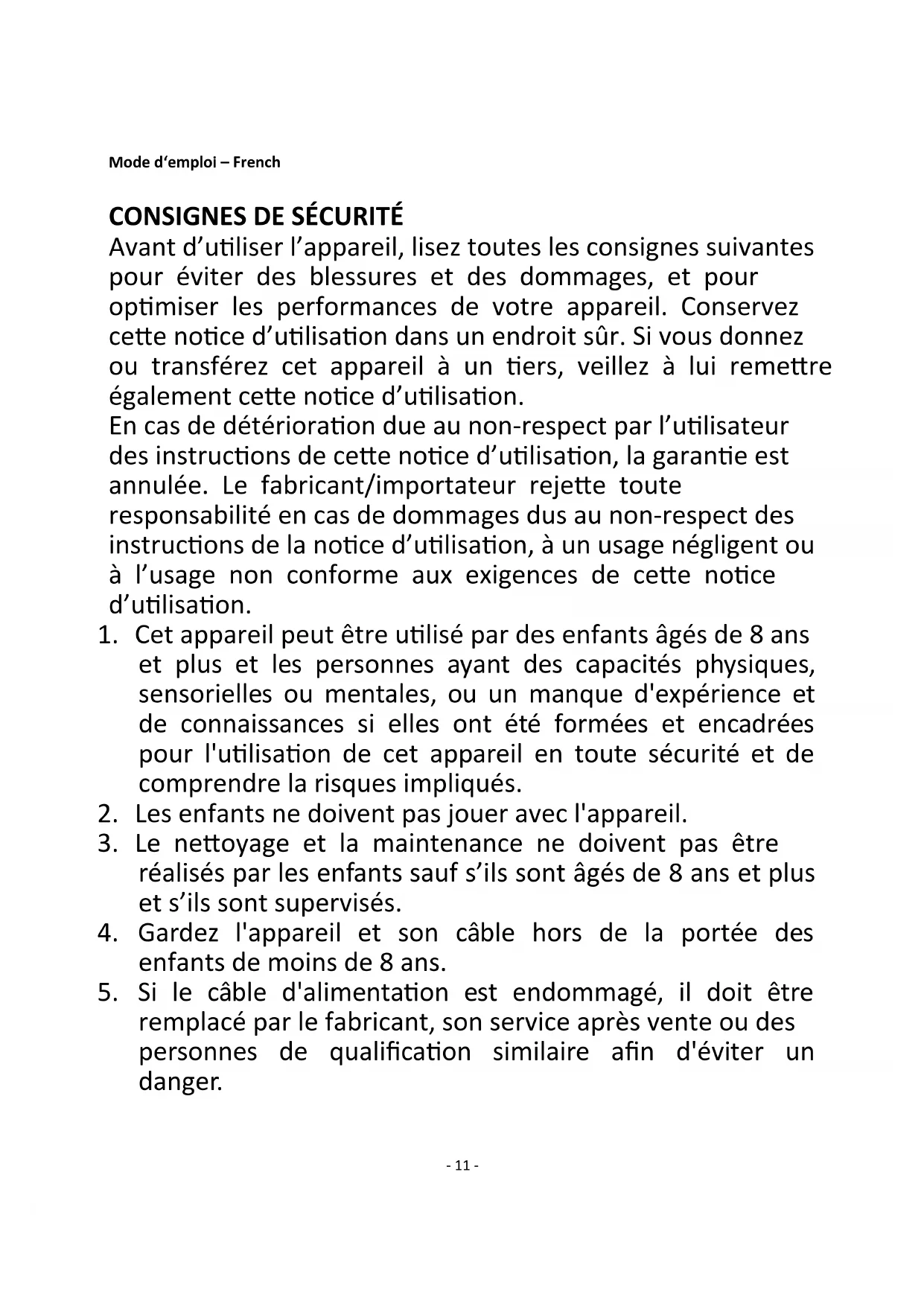 Avant d’utiliser l’appareil, lisez toutes les consignes suivantes pour éviter des blessures et des dommages, et pour optimiser les performances de votre appareil. Conservez cette notice d’utilisation dans un endroit sûr. Si vous donnez ou transférez cet appareil à un tiers, veillez à lui remettre également cette notice d’utilisation. En cas de détérioration due au non-respect par l’utilisateur des instructions de cette notice d’utilisation, la garantie est annulée. Le fabricant/importateur rejette toute responsabilité en cas de dommages dus au non-respect des instructions de la notice d’utilisation, à un usage négligent ou à l’usage non conforme aux exigences de cette notice d’utilisation.