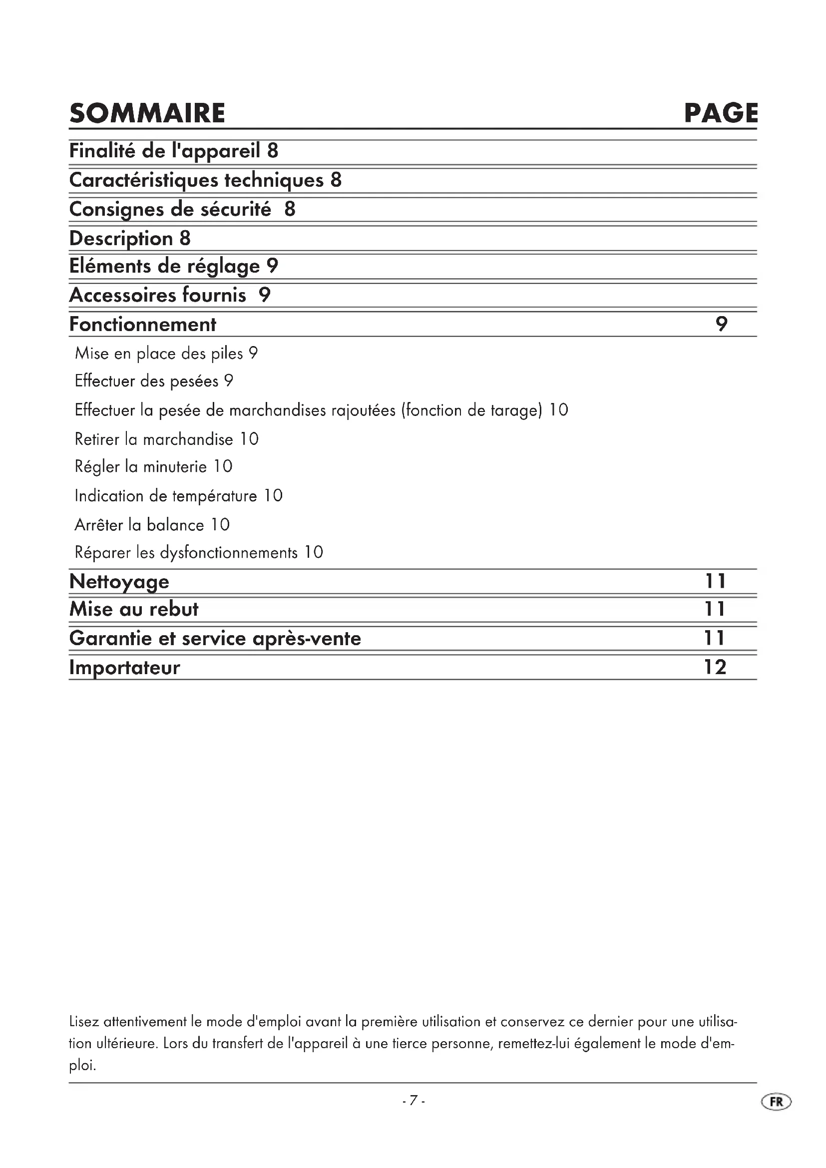 affiche „Err“, la balance est en surcharge. Retirez la marchandise à peser. Ne placez jamais plus de 5 kg sur la balance. ³ Si l'écran affiche brièvement "Err" et que la balance ne peut pas être allumée, elle est alors en surcharge. Retirez la marchandise de la balance et remettez celle-ci en marche. Ne placez jamais plus de 5 kg sur la balance. ³ Si votre balance ne fonctionne pas comme pré- vu, remplacez les piles. Si l'anomalie est toujours présente, veuillez contacter le fabricant. ³ Si l'écran affiche "LO", c'est que les piles sont vides. Remplacez les piles. IB_KH1156_KOE1427_FR_1 09.04.2008 16:30 Uhr Seite 10- 11 - Nettoyage