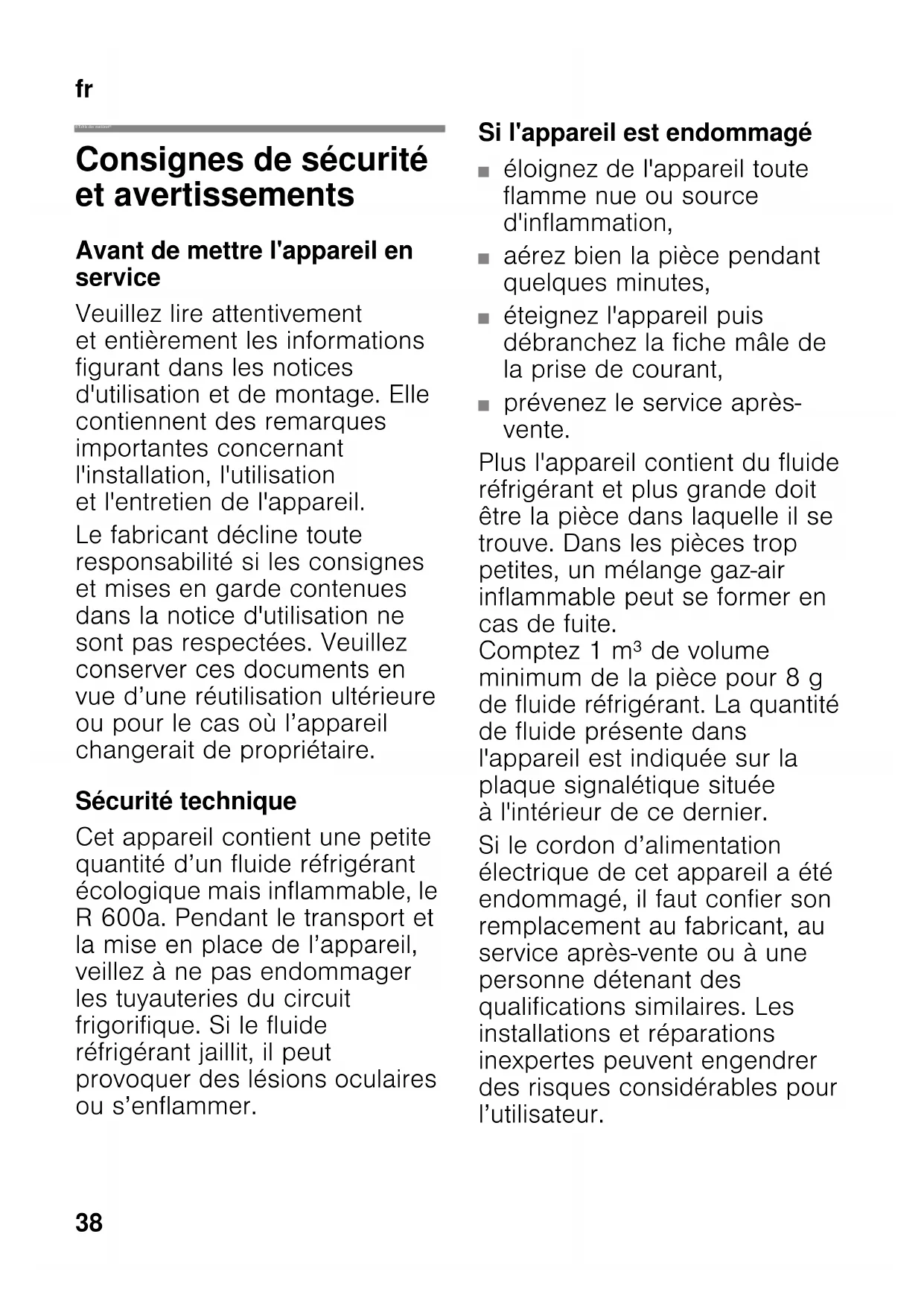 frTable des matières frMode d’emploi Consignes de sécurité et avertissements Avant de mettre l'appareil en service Veuillez lire attentivement et entièrement les informations figurant dans les notices d'utilisation et de montage. Elle contiennent des remarques importantes concernant l'installation, l'utilisation et l'entretien de l'appareil. Le fabricant décline toute responsabilité si les consignes et mises en garde contenues dans la notice d'utilisation ne sont pas respectées. Veuillez conserver ces documents en vue d’une réutilisation ultérieure ou pour le cas où l’appareil changerait de propriétaire. Sécurité technique Cet appareil contient une petite quantité d’un fluide réfrigérant écologique mais inflammable, le R 600a. Pendant le transport et la mise en place de l’appareil, veillez à ne pas endommager les tuyauteries du circuit frigorifique. Si le fluide réfrigérant jaillit, il peut provoquer des lésions oculaires ou s’enflammer. Si l'appareil est endommagé ■ éloignez de l'appareil toute flamme nue ou source d'inflammation, ■ aérez bien la pièce pendant quelques minutes, ■ éteignez l'appareil puis débranchez la fiche mâle de la prise de courant, ■ prévenez le service après- vente. Plus l'appareil contient du fluide réfrigérant et plus grande doit être la pièce dans laquelle il se trouve. Dans les pièces trop petites, un mélange gaz-air inflammable peut se former en cas de fuite. Comptez 1 m³ de volume minimum de la pièce pour 8 g de fluide réfrigérant. La quantité de fluide présente dans l'appareil est indiquée sur la plaque signalétique située à l'intérieur de ce dernier. Si le cordon d’alimentation électrique de cet appareil a été endommagé, il faut confier son remplacement au fabricant, au service après-vente ou à une personne détenant des qualifications similaires. Les installations et réparations inexpertes peuvent engendrer des risques considérables pour l’utilisateur.fr