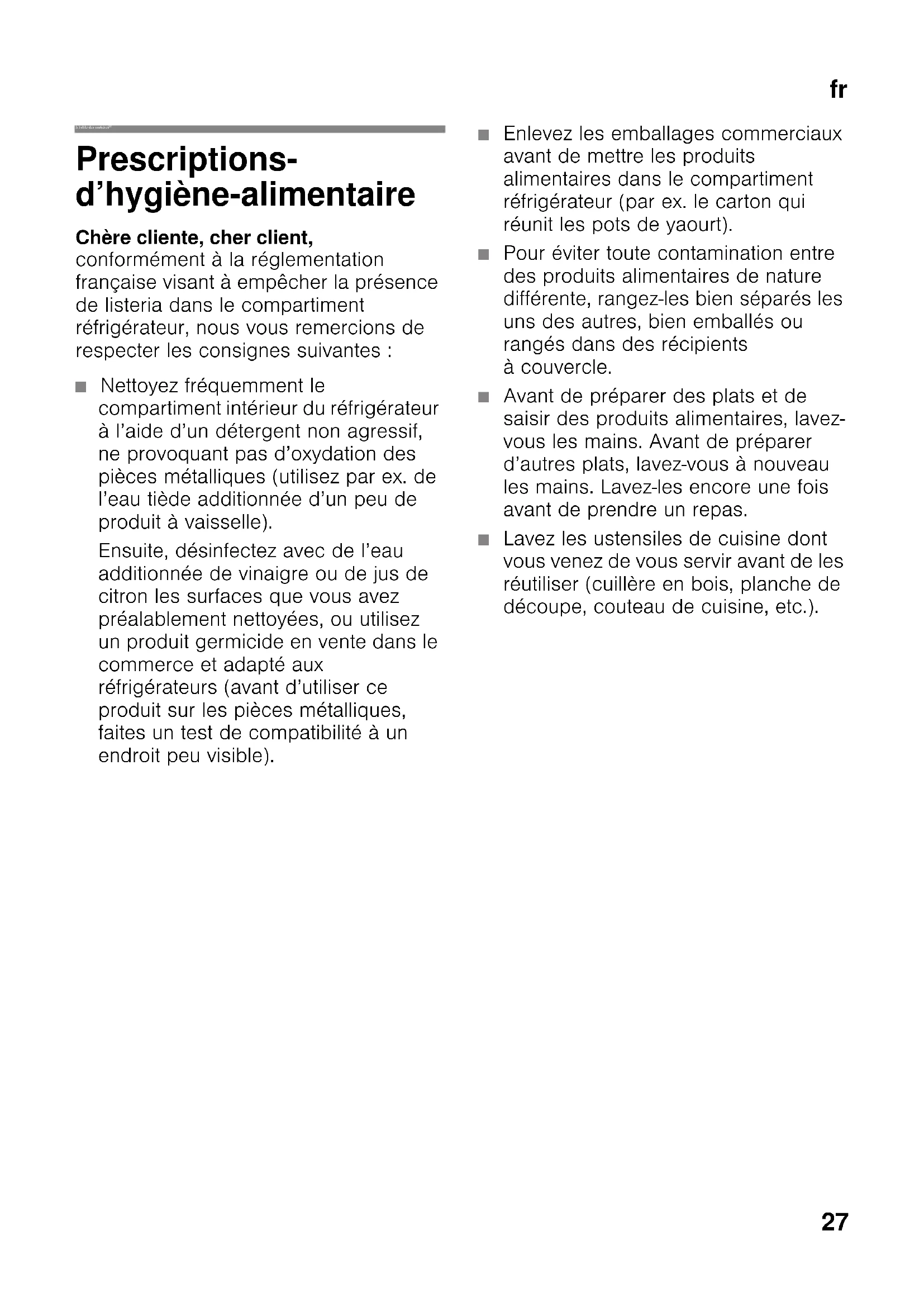 frTable des matières frMode d’emploi Prescriptions- d’hygiène-alimentaire Chère cliente, cher client, conformément à la réglementation française visant à empêcher la présence de listeria dans le compartiment réfrigérateur, nous vous remercions de respecter les consignes suivantes : ■ Nettoyez fréquemment le compartiment intérieur du réfrigérateur à l’aide d’un détergent non agressif, ne provoquant pas d’oxydation des pièces métalliques (utilisez par ex. de l’eau tiède additionnée d’un peu de produit à vaisselle). Ensuite, désinfectez avec de l’eau additionnée de vinaigre ou de jus de citron les surfaces que vous avez préalablement nettoyées, ou utilisez un produit germicide en vente dans le commerce et adapté aux réfrigérateurs (avant d’utiliser ce produit sur les pièces métalliques, faites un test de compatibilité à un endroit peu visible). ■ Enlevez les emballages commerciaux avant de mettre les produits alimentaires dans le compartiment réfrigérateur (par ex. le carton qui réunit les pots de yaourt). ■ Pour éviter toute contamination entre des produits alimentaires de nature différente, rangez-les bien séparés les uns des autres, bien emballés ou rangés dans des récipients à couvercle. ■ Avant de préparer des plats et de saisir des produits alimentaires, lavez- vous les mains. Avant de préparer d’autres plats, lavez-vous à nouveau les mains. Lavez-les encore une fois avant de prendre un repas. ■ Lavez les ustensiles de cuisine dont vous venez de vous servir avant de les réutiliser (cuillère en bois, planche de découpe, couteau de cuisine, etc.).fr