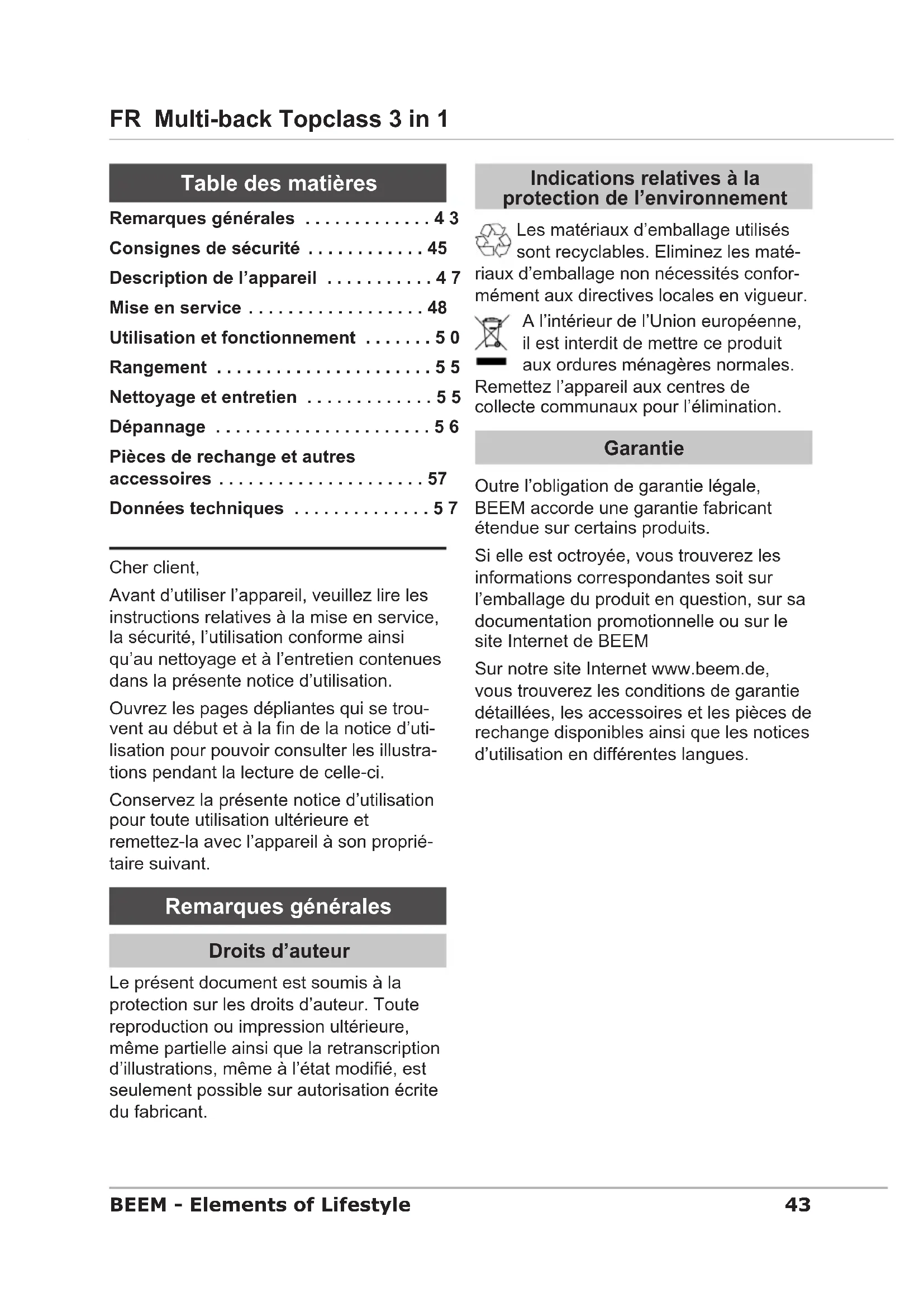 Retrouvez gratuitement la notice de l'appareil Multiback Topclass 3 in 1 BEEM au format PDF.