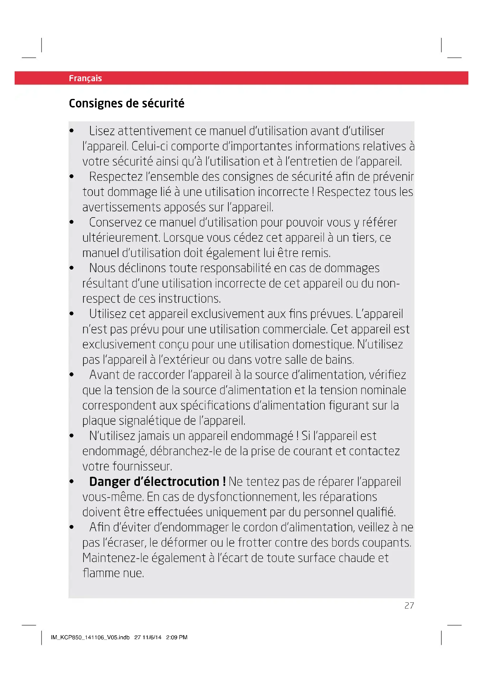 - And’éviterd’endommagerlecordond’alimentation,veillezàne pasl’écraser,ledéformeroulefrottercontredesbordscoupants. Maintenez-leégalementàl’écartdetoutesurfacechaudeet ammenue. Consignes de sécurité IM_KCP850_141106_V05.indb 27 11/6/14 2:09 PM28 Français Français