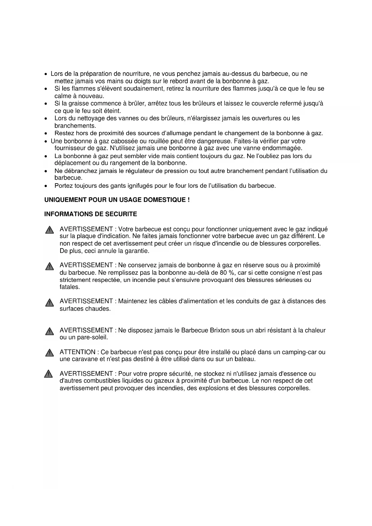 AVERTISSEMENT : Notre barbecue est conçu pour fonctionner uniquement avec le gaz indiqué sur la plaque d'indication. Ne faites jamais fonctionner le barbecue avec un gaz différent. Le non-respect de cet avertissement peut créer un risque d'incendie ou de blessures corporelles. De plus, ceci annule la garantie. AVERTISSEMENT: Ne conservez jamais de bonbonne à gaz en réserve sous ou à proximité du barbecue. Ne remplissez pas la bonbonne au-delà de 80%, car si cette consigne n'est pas strictement respectée, un incendie peut s'ensuivre provoquant des blessures sérieuses ou fatales. AVERTISSEMENT: Maintenez les câbles d'alimentation et les conduits de gaz à distance des surfaces chaudes. AVERTISSEMENT: Ne disposez jamais le Barbecue Brixton sous un abri résistant à la chaleur ou un pare-soleil. ATTENTION: Ce barbecue n'est pas conçu pour être installé ou placé dans un camping-car ou une caravane et n'est pas destiné à être utilisé dans ou sur un bateau. AVERTISSEMENT: Pour votre propre sécurité, ne stockez ni n'utilisez jamais d'essence ou autres combustibles liquides ou gazeux à proximité d'un barbecue. Le non-respect de cet avertissement peut provoquer des incendies, des explosions et des blessures corporelles.