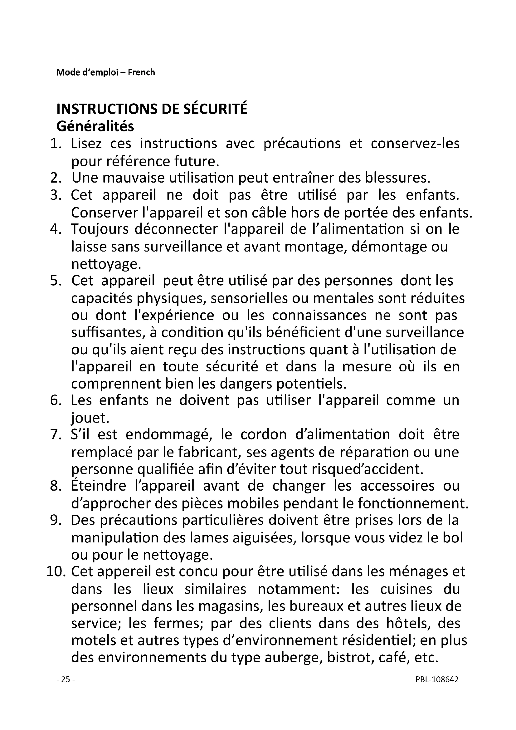 Ne pas faire fonctionner le mixeur s'il ne contient pas d'eau, de glace ou de fruits. Les lames s'useraient plus vite et la durée de vie de la machine en serait raccourcie. Il est interdit de démonter l'appareil. Ne pas utiliser d'ustensile pointu pour toucher la carafe.- 29 - PBL-108642