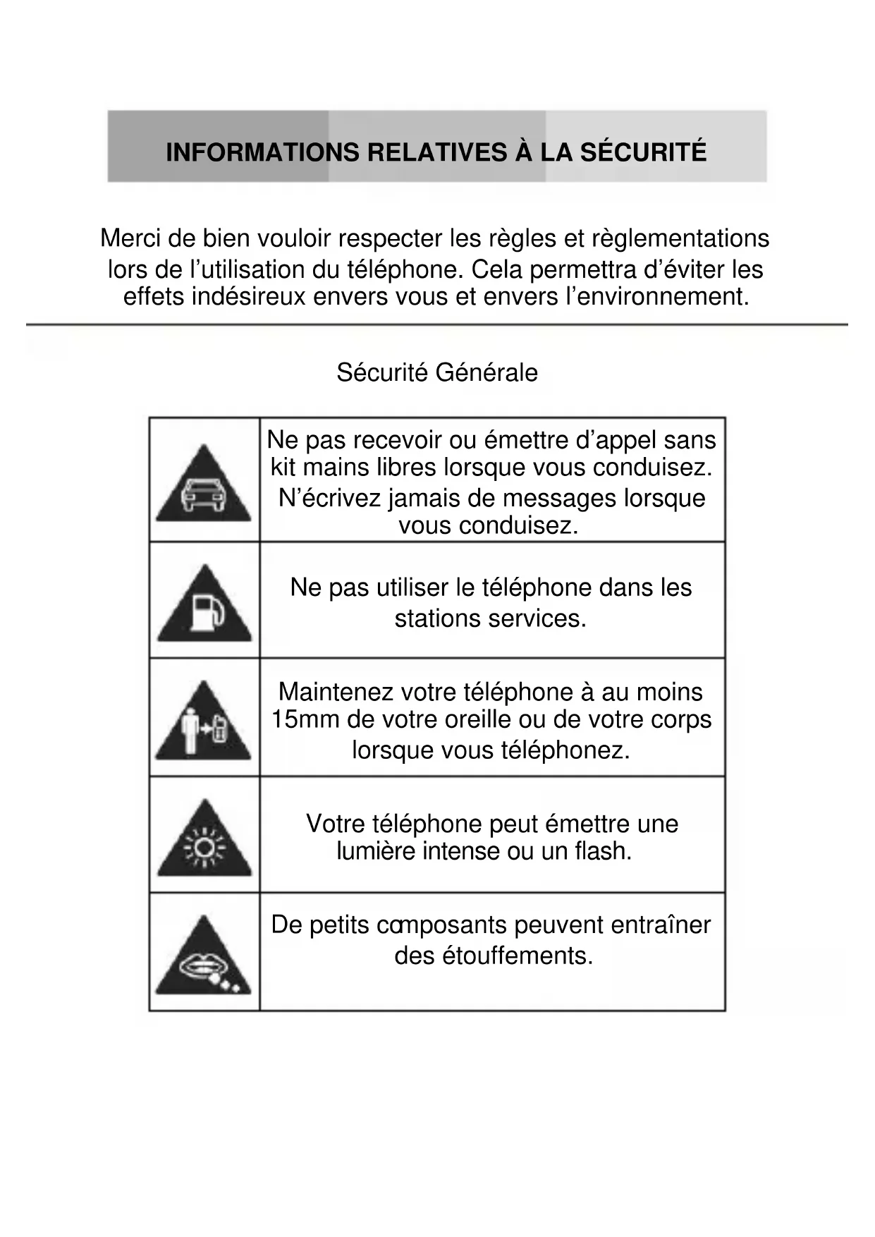 Merci de bien vouloir respecter les règles et règlementations lors de l’utilisation du téléphone. Cela permettra d’éviter les effets indésireux envers vous et envers l’environnement. Sécurité Générale
