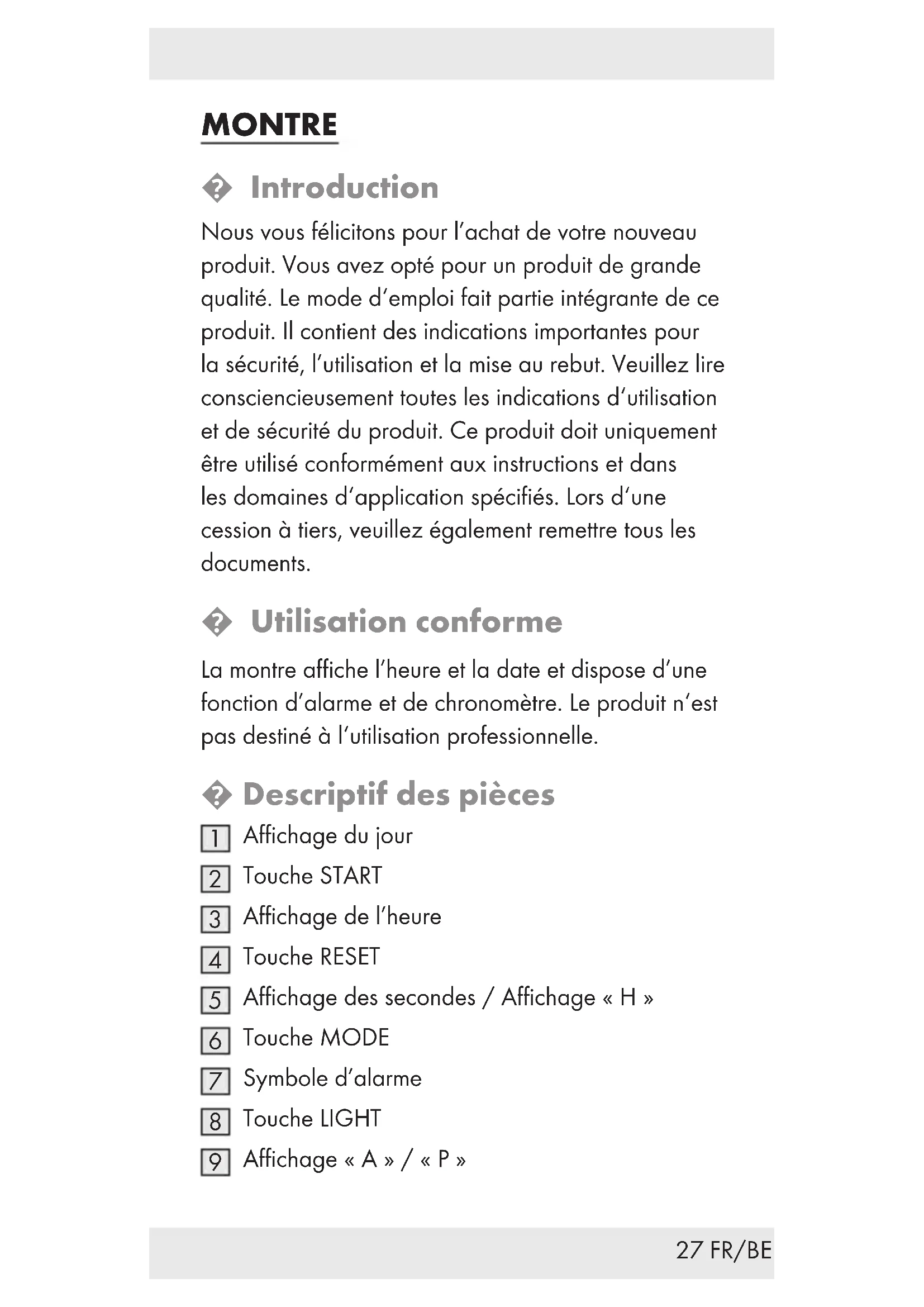 pour mettre le chronomètre à 0. Nettoyage et entretien Nettoyez le produit avec un chiffon sec ne peluchant pas. Un chiffon à lunettes est idéal. Recyclage L’emballage se compose de matières recyclables qui peuvent être mises au rebut dans les déchetteries locales. Les possibilités de recyclage des produits usés sont à demander auprès de votre municipalité. Pour le respect de l‘environnement, lorsque vous n‘utilisez plus votre produit, ne le jetez pas avec les ordures ménagères, mais entreprenez un recyclage adapté. Pour obtenir des renseignements et des horaires d‘ouverture concernant les points de collecte, vous pouvez contacter votre administration locale.36 FR/BE Les piles défectueuses ou usagées doivent être recyclées conformément à la directive 2006 / 66 / CE et ses modifications. Les piles et / ou l‘appareil doivent être retournés dans les centres de collecte. Pollution de l’environnement par mise au rebut incorrecte des piles ! Les piles ne doivent pas être mises au rebut dans les ordures ménagères. Elles peuvent contenir des métaux lourds toxiques et doivent être considérés comme des déchets spéciaux. Les symboles chimiques des métaux lourds sont les suivants : Cd = cadmium, Hg= mercure, Pb = plomb. Pour cette raison, veuillez toujours déposer les piles usées dans les conteneurs de recyclage communaux. Garantie L’appareil a été fabriqué selon des critères de qualité stricts et contrôlé consciencieusement avant sa livraison. En cas de défaillance, vous êtes en droit de retourner ce produit au vendeur. La présente garantie ne constitue pas une restriction de vos droits légaux. Cet appareil bénéficie d‘une garantie de 3 ans à compter de sa date d’achat. La durée de garantie débute à la date d’achat. Veuillez conserver le ticket de caisse original. Il fera office de preuve d’achat.37 FR/BE Si un problème matériel ou de fabrication devait survenir dans 3 ans suivant la date d‘achat de ce produit, nous assurons à notre discrétion la réparation ou le remplacement de l‘appareil sans frais supplémentaires. La garantie prend fin si le produit est endommagé suite à une utilisation inappropriée ou à un entretien défaillant. La garantie couvre les vices matériels et de fabrication. Cette garantie ne s’étend pas aux pièces du produit soumises à une usure normale (p. ex. des batteries) et qui, par conséquent, peuvent être considérées comme des pièces d’usure, ni aux dommages sur des composants fragiles, comme des interrupteurs, des batteries et des éléments fabriqués en verre. La garantie ne couvre pas non plus la perte de l’étanchéité à l’eau. L’état d’étanchéité à l’eau n’est pas une propriété durable et fait l’objet d’une maintenance périodique. Veuillez noter que votre garantie devient caduque pour les cas suivants: ouverture et la réparation de votre montre par des personnes non autorisées.38 NL/BE HORLOGE Inleiding Hartelijk gefeliciteerd met de aankoop van uw nieuwe product. U heeft voor een hoogwaardig product gekozen. De gebruiksaanwijzing is een deel van het product. Deze bevat belangrijke aanwijzingen voor veiligheid, gebruik en verwijdering. Maakt U zich voor de ingebruikname van het product met alle bedienings- en veiligheidsvoorschriften vertrouwd. Gebruik het apparaat alleen zoals beschreven en voor de aangegeven toepassingsgebieden. Overhandig alle documenten bij doorgifte van het product aan derden. Doelmatig gebruik Het horloge geeft tijd en datum weer en beschikt over een alarm- en stopwatchfunctie. Het product is niet voor zakelijke doeleinden geschikt. Onderdelenbeschrijving