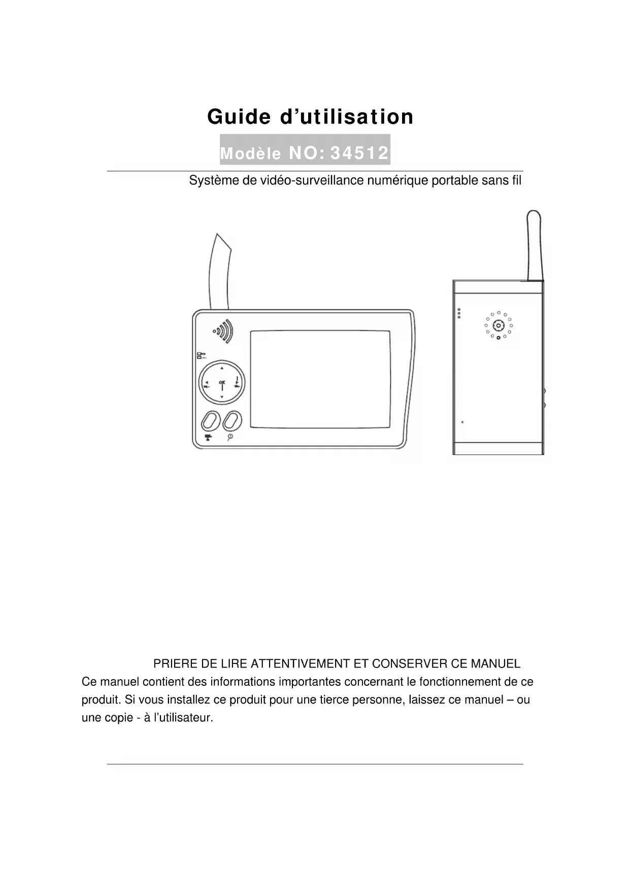 Guide d’utilisation Modèle NO: 34512 Système de vidéo-surveillance numérique portable sans fil