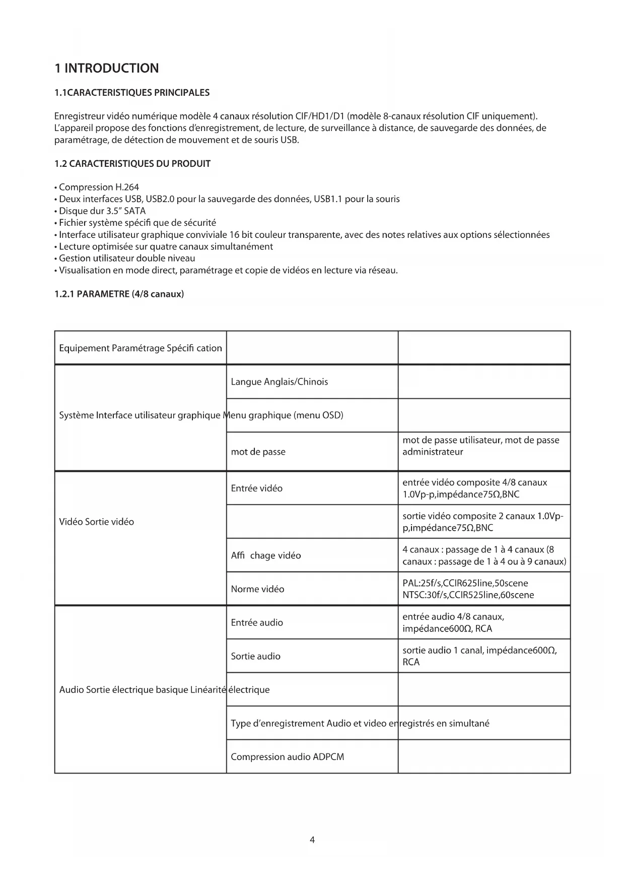 1 INTRODUCTION 1.1CARACTERISTIQUES PRINCIPALES Enregistreur vidéo numérique modèle 4 canaux résolution CIF/HD1/D1 (modèle 8-canaux résolution CIF uniquement). L’appareil propose des fonctions d’enregistrement, de lecture, de surveillance à distance, de sauvegarde des données, de paramétrage, de détection de mouvement et de souris USB.