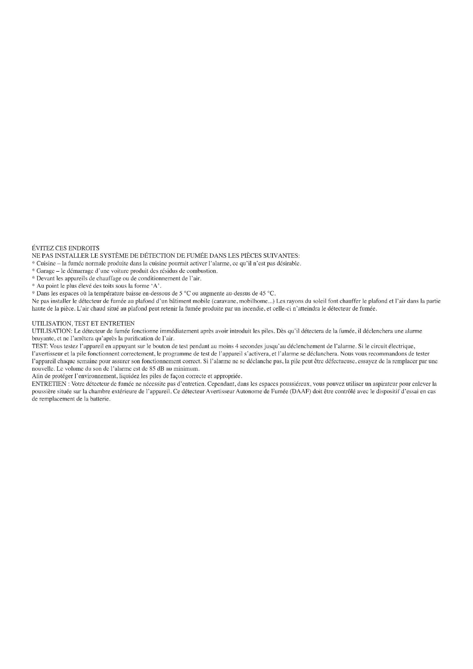 UTILISATION: Le détecteur de fumée fonctionne immédiatement après avoir introduit les piles. Dès qu’il détectera de la fumée, il déclenchera une alarme bruyante, et ne l’arrêtera qu’après la purication de l’air. TEST: Vous testez l’appareil en appuyant sur le bouton de test pendant au moins 4 secondes jusqu’au déclenchement de l’alarme. Si le circuit électrique, l’avertisseur et la pile fonctionnent correctement, le programme de test de l’appareil s’activera, et l’alarme se déclanchera. Nous vous recommandons de tester l’appareil chaque semaine pour assurer son fonctionnement correct. Si l’alarme ne se déclanche pas, la pile peut être défectueuse, essayez de la remplacer par une nouvelle. Le volume du son de l’alarme est de 85 dB au minimum. An de protéger l’environnement, liquidez les piles de façon correcte et appropriée. ENTRETIEN : Votre détecteur de fumée ne nécessite pas d’entretien. Cependant, dans les espaces poussiéreux, vous pouvez utiliser un aspirateur pour enlever la poussière située sur la chambre extérieure de l’appareil. Ce détecteur Avertisseur Autonome de Fumée (DAAF) doit être contrôlé avec le dispositif d’essai en cas de remplacement de la batterie.REMPLACEMENT DES PILES La pile du détecteur de fumée 9V DC devrait durer, en utilisation normale, pendant 1 an au minimum. Le détecteur de fumée est équipé d’un indicateur pour informer que la pile est pratiquement déchargée. PLACEMENT Votre système de détection de fumée est destiné à être facilement installé au plafond. Un équipement d’installation complet est fourni avec chaque système de détection de fumée. Tout d’abord, tenez les attaches près du plafond, prenez un crayon et marquez 2 point pour les trous à percer. Prenez une perceuse pour forer les deux trous, et xez les deux attaches au plafond à l’aide des vis fournies. Dans les revêtements en bois ou dans les solives en bois, utilisez seulement une mèche de 2,5 mm et percez 20 mm à peu près, attachez le système grâce aux vis fournies. Dans le cas du béton, utilisez une mèche de 5,5 mm et percez 25-30 mm en profondeur. Veillez que les attaches soient xées correctement dans les trous. Ensuite, insérez les piles et xez le détecteur aux attaches. Le système est muni d’un équipement de sécurité qui empêche de xer le système à l’attache sans avoir préalablement inséré une pile. Si votre détecteur de fumée ne se xe pas correctement à l’attache, assurez-vous que les piles sont correctement placées. HOTLINE 0900 / 51 100