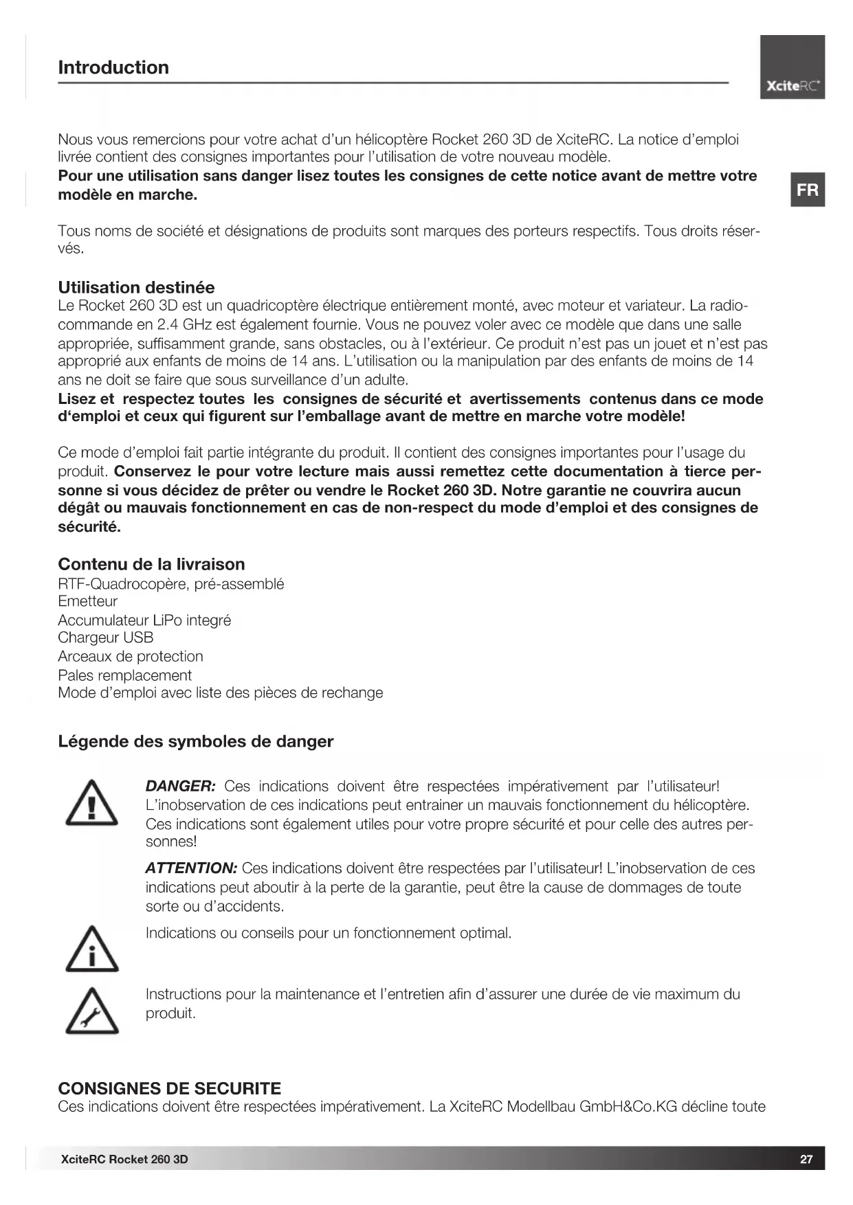 Introduction Nous vous remercions pour votre achat d’un hélicoptère Rocket 260 3D de XciteRC. La notice d’emploi livrée contient des consignes importantes pour l’utilisation de votre nouveau modèle. Pour une utilisation sans danger lisez toutes les consignes de cette notice avant de mettre votre modèle en marche. Tous noms de société et désignations de produits sont marques des porteurs respectifs. Tous droits réser- vés. Utilisation destinée Le Rocket 260 3D est un quadricoptère électrique entièrement monté, avec moteur et variateur. La radio- commande en 2.4 GHz est également fournie. Vous ne pouvez voler avec ce modèle que dans une salle appropriée, suffisamment grande, sans obstacles, ou à l’extérieur. Ce produit n’est pas un jouet et n’est pas approprié aux enfants de moins de 14 ans. L’utilisation ou la manipulation par des enfants de moins de 14 ans ne doit se faire que sous surveillance d’un adulte. Lisez et respectez toutes les consignes de sécurité et avertissements contenus dans ce mode d‘emploi et ceux qui figurent sur l’emballage avant de mettre en marche votre modèle! Ce mode d’emploi fait partie intégrante du produit. Il contient des consignes importantes pour l’usage du produit. Conservez le pour votre lecture mais aussi remettez cette documentation à tierce per- sonne si vous décidez de prêter ou vendre le Rocket 260 3D. Notre garantie ne couvrira aucun dégât ou mauvais fonctionnement en cas de non-respect du mode d’emploi et des consignes de sécurité. Contenu de la livraison RTF-Quadrocopère, pré-assemblé Emetteur Accumulateur LiPo integré Chargeur USB Arceaux de protection Pales remplacement Mode d’emploi avec liste des pièces de rechange Légende des symboles de danger