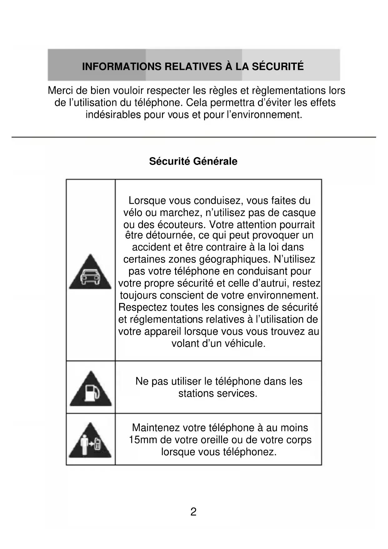 Merci de bien vouloir respecter les règles et règlementations lors de l’utilisation du téléphone. Cela permettra d’éviter les effets indésirables pour vous et pour l’environnement.