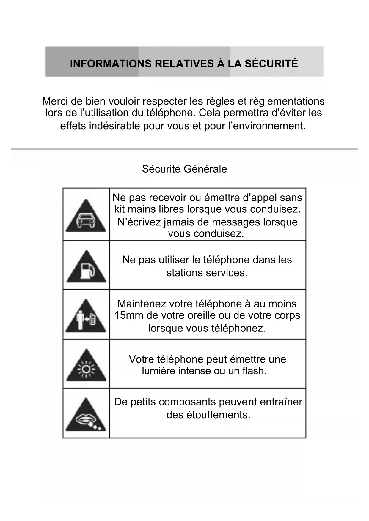 Merci de bien vouloir respecter les règles et règlementations lors de l’utilisation du téléphone. Cela permettra d’éviter les effets indésirable pour vous et pour l’environnement.