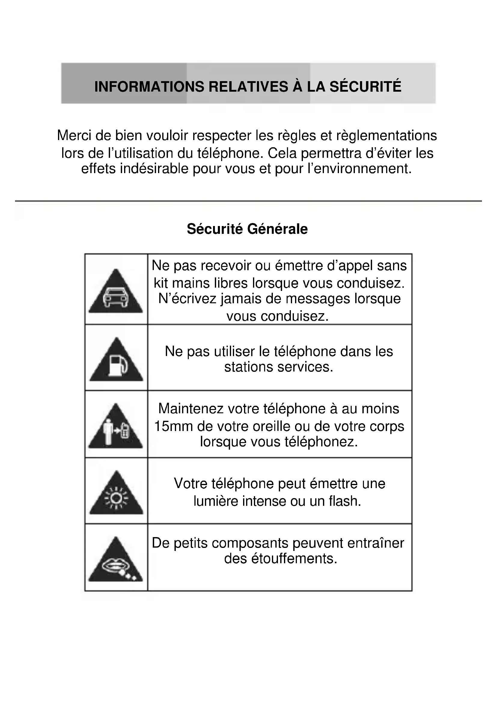 Merci de bien vouloir respecter les règles et règlementations lors de l’utilisation du téléphone. Cela permettra d’éviter les effets indésirable pour vous et pour l’environnement.