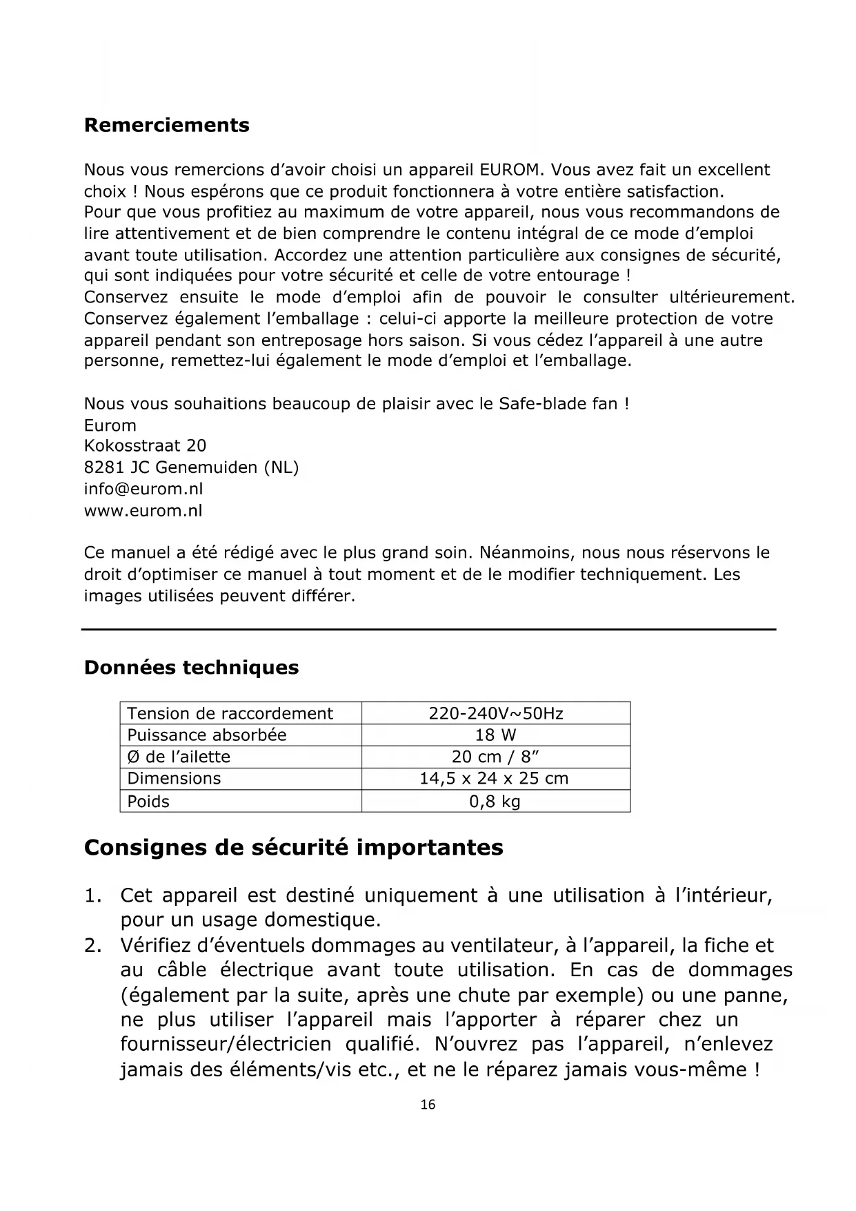 EN 61000-3-3:2013+A1:2019 RoHS 2011/65/EU&(EU)2015/863 Genemuiden, 07-10-2020 W.J. Bakker, alg. dir.16 Remerciements Nous vous remercions d’avoir choisi un appareil EUROM. Vous avez fait un excellent choix ! Nous espérons que ce produit fonctionnera à votre entière satisfaction. Pour que vous profitiez au maximum de votre appareil, nous vous recommandons de lire attentivement et de bien comprendre le contenu intégral de ce mode d’emploi avant toute utilisation. Accordez une attention particulière aux consignes de sécurité, qui sont indiquées pour votre sécurité et celle de votre entourage ! Conservez ensuite le mode d’emploi afin de pouvoir le consulter ultérieurement. Conservez également l’emballage : celui-ci apporte la meilleure protection de votre appareil pendant son entreposage hors saison. Si vous cédez l’appareil à une autre personne, remettez-lui également le mode d’emploi et l’emballage. Nous vous souhaitions beaucoup de plaisir avec le Safe-blade fan ! Eurom Kokosstraat 20 8281 JC Genemuiden (NL) info@eurom.nl www.eurom.nl Ce manuel a été rédigé avec le plus grand soin. Néanmoins, nous nous réservons le droit d’optimiser ce manuel à tout moment et de le modifier techniquement. Les images utilisées peuvent différer.