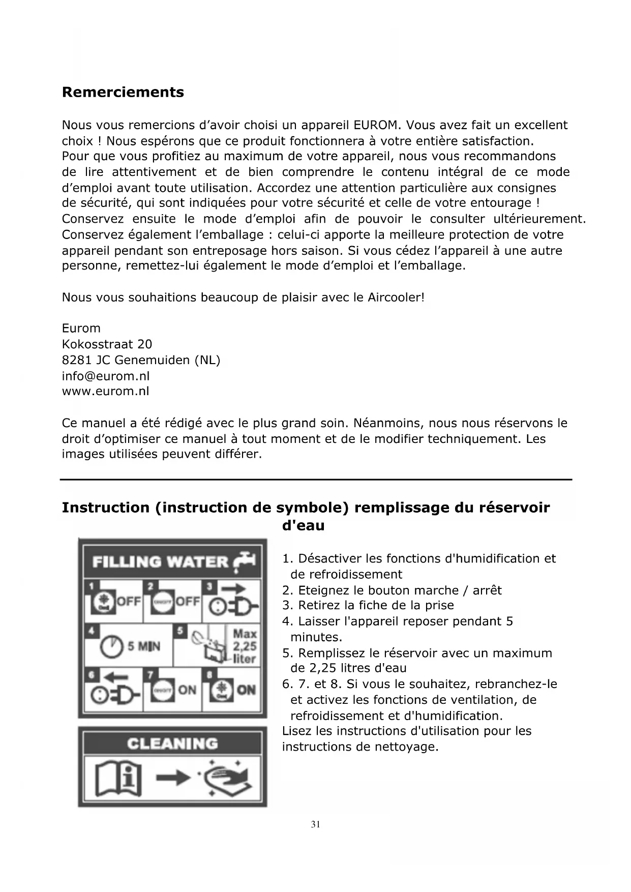 1 = panneau avant 2 = filtre 3 = filtre « nid-d’abeilles » A la fin de la saison, rangez soigneusement le radiateur (propre et sec), si possible dans l’emballage d’origine. Placez-le debout dans un endroit frais, sec et à l’abri de la poussière. Ne laissez jamais de l'eau dans le réservoir ou le corps pendant plus de quelques jours. Remplacez-la ou jetez-la, lavez et rincez le réservoir et laissez le refroidisseur d’air sécher si vous ne l'utilisez pas (temporairement). Problèmes et solutions L'appareil ne fonctionne pas Pas de courant. Vérifiez si la fiche est insérée dans la prise de courant et si la prise de courant est alimentée. La touche marche/arrêt est-elle bien enfoncée ? Il y a une panne d’une pièce interne du système électrique. Adressez-vous à votre fournisseur ou à un électricien. L'appareil ne s’éteint pas La touche marche/arrêt est-elle bien enfoncée ? Il y a une panne d’une pièce interne du système électrique. Adressez-vous à votre fournisseur ou à un électricien. Bruit inhabituel Une pièce interne n’est pas correctement positionnée. Sortez les filtres et le réservoir d’eau et fixez-les correctement.40 Une roue pivotante est cassée/détachée/a disparu ; adressez-vous à votre fournisseur. Une panne interne ; adressez-vous à votre fournisseur. L'appareil n’humidifie pas ou trop peu Les filtres sont bouchés par la saleté ; nettoyez-les. Panne technique ; adressez-vous à votre fournisseur. Pour d’autres pannes, veuillez vous adresser à votre fournisseur. Élimination Au sein de l’UE, ce symbole indique que ce produit ne peut être éliminé avec les déchets ménagers habituels. D’anciens appareils contiennent des matériaux précieux recyclables, qui doivent être reconditionnés pour ne pas nuire à l’environnement et à la santé humaine par une collecte incontrôlée des déchets. Par conséquent, nous vous prions de déposer vos anciens appareils dans un point de collecte destiné à cet effet ou de vous adresser au fournisseur où vous avez acheté l’appareil. Ce dernier veillera à ce qu’un maximum de pièces de l’appareil soient réutilisées. Déclaration CE Par la présente, Eurom bv. - Genemuiden-NL, déclare que le produit Refroidisseur d’air de marque EUROM, type AIRCOOLER répondent à la directive LVD 2014/35/EU et à la directive EMC 2014/30/EU et sont conformes aux normes ci-dessous : EN 60335-1:2012+A11:2014+A13:2017 EN 60335-2-80:2003+A1:2004+A2:2009 EN 60335-2-98:2003+A1:2005+A2:2008 EN 62233:2008 EN 55014-1:2017 EN 55014-2:2015 EN 61000-3-2:2014 EN 61000-3-3:2013 RoHS 2011/65/EU&(EU)2015/863 Genemuiden, 07-10-2021 W.J. Bakker, alg.dir.41 Grazie Grazie per aver scelto un dispositivo EUROM. Hai fatto una buona scelta! Speriamo che funzionerà per la vostra completa soddisfazione. Per ottenere il meglio dal tuo dispositivo è importante leggere questo manuale attentamente e nella sua interezza prima di usarlo e capirlo. Prestare particolare attenzione alle norme di sicurezza; che sono elencati per proteggere te e il tuo ambiente! Quindi salvare le istruzioni operative per riferimento futuro. Conserva anche la confezione: questa è la migliore protezione per il tuo dispositivo durante la conservazione fuori stagione. E se trasferisci il dispositivo a qualcun altro, includi il manuale dell'utente e la confezione. Vi auguriamo tanto piacere con il Aircooler! EUROM Kokosstraat 20 8281 JC Genemuiden (NL) info@eurom.nl www.eurom.nl Questo manuale è stato compilato con la massima cura. Tuttavia, ci riserviamo il diritto di ottimizzare questo manuale in qualsiasi momento e di regolarlo tecnicamente. Le immagini utilizzate potrebbero essere diverse.