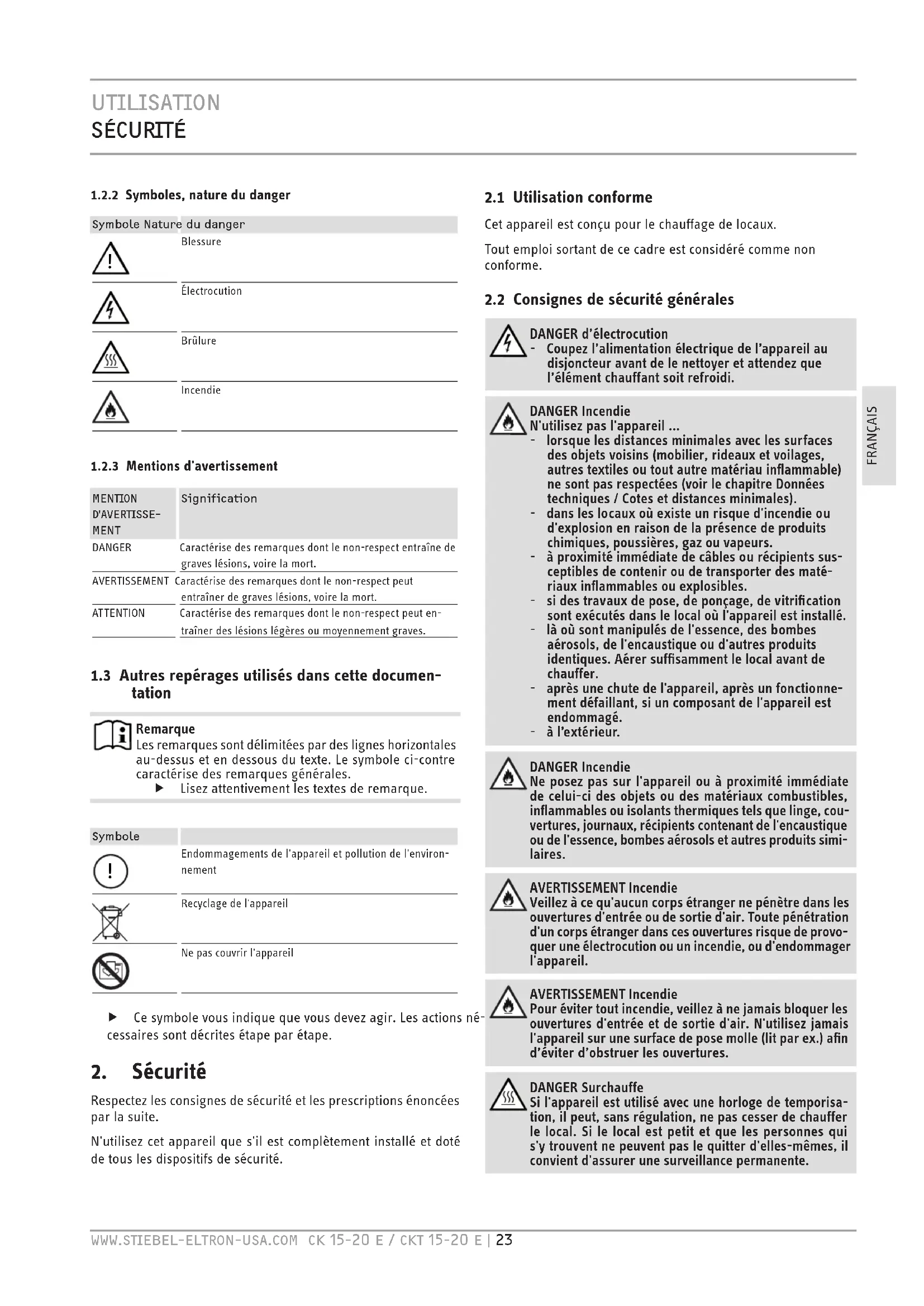 MENTION D'AVERTISSEMENT Nature du dangerSont indiqués ici les risques éventuellement encourus en cas de non-respect de la consigne de sécurité. f Sont indiqués ici les mesures permettant de pal- lier au danger.UTILISATION SéCURITé WWW.STIEBEL-ELTRON-USA.COM CK 15-20 E / CKT 15-20 E | 23FRANÇAIS1.2.2 Symboles, nature du dangerSymbole Nature du danger Blessure Électrocution Brûlure Incendie