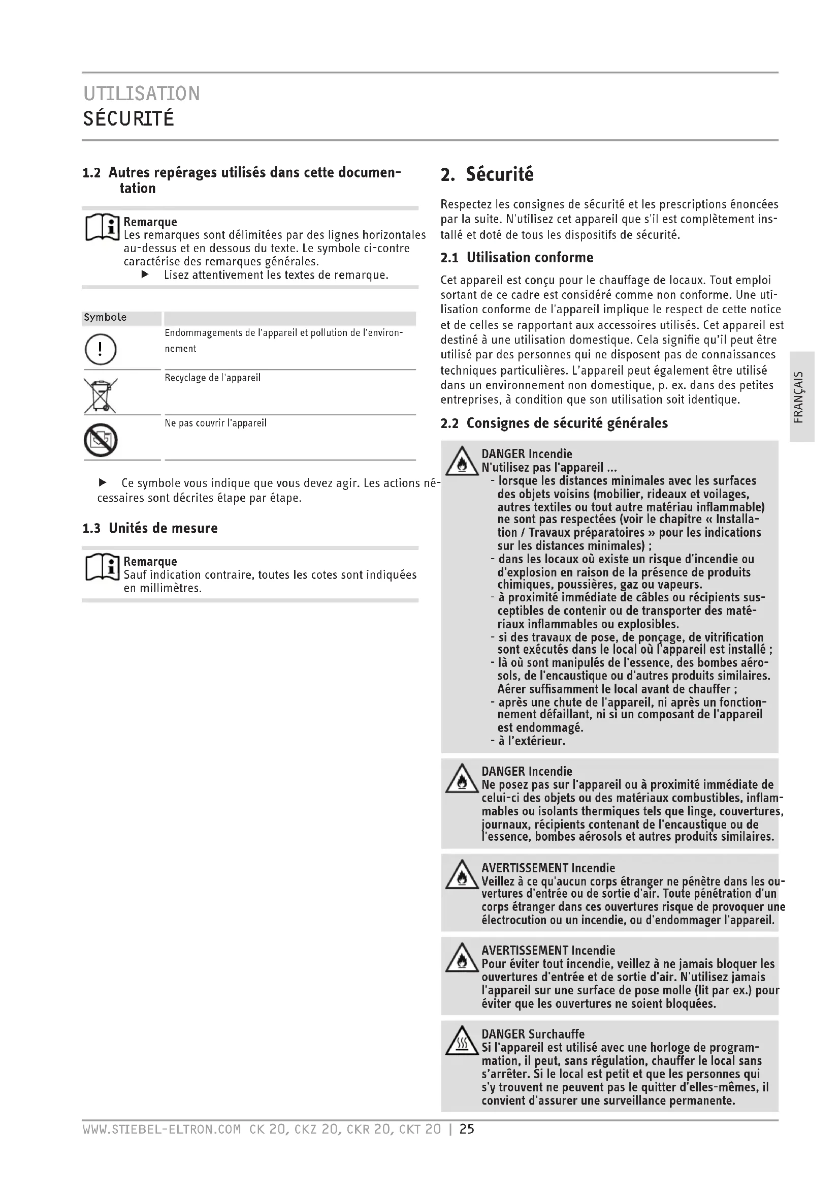 DANGER Incendie N'utilisez pas l'appareil ... - lorsque les distances minimales avec les surfaces des objets voisins (mobilier, rideaux et voilages, autres textiles ou tout autre matériau inflammable) ne sont pas respectées (voir le chapitre « Installa- tion / Travaux préparatoires » pour les indications sur les distances minimales) ; - dans les locaux où existe un risque d'incendie ou d'explosion en raison de la présence de produits chimiques, poussières, gaz ou vapeurs. - à proximité immédiate de câbles ou récipients sus- ceptibles de contenir ou de transporter des maté- riaux inflammables ou explosibles. - si des travaux de pose, de ponçage, de vitrification sont exécutés dans le local où l'appareil est installé ; - là où sont manipulés de l'essence, des bombes aéro- sols, de l'encaustique ou d'autres produits similaires. Aérer suffisamment le local avant de chauffer ; - après une chute de l'appareil, ni après un fonction- nement défaillant, ni si un composant de l'appareil est endommagé. - à l’extérieur. DANGER Incendie Ne posez pas sur l'appareil ou à proximité immédiate de celui-ci des objets ou des matériaux combustibles, inflam- mables ou isolants thermiques tels que linge, couvertures, journaux, récipients contenant de l'encaustique ou de l'essence, bombes aérosols et autres produits similaires. AVERTISSEMENT Incendie Veillez à ce qu'aucun corps étranger ne pénètre dans les ou- vertures d'entrée ou de sortie d'air. Toute pénétration d'un corps étranger dans ces ouvertures risque de provoquer une électrocution ou un incendie, ou d'endommager l'appareil. AVERTISSEMENT Incendie Pour éviter tout incendie, veillez à ne jamais bloquer les ouvertures d'entrée et de sortie d'air. N'utilisez jamais l'appareil sur une surface de pose molle (lit par ex.) pour éviter que les ouvertures ne soient bloquées. DANGER Surchauffe Si l'appareil est utilisé avec une horloge de program- mation, il peut, sans régulation, chauffer le local sans s’arrêter. Si le local est petit et que les personnes qui s'y trouvent ne peuvent pas le quitter d'elles-mêmes, il convient d'assurer une surveillance permanente.utilisation descRiPtion de l'aPPaReil 26 | cK 20, cKz 20, cKR 20, cKt 20 WWW.stieBel-eltRon.coM