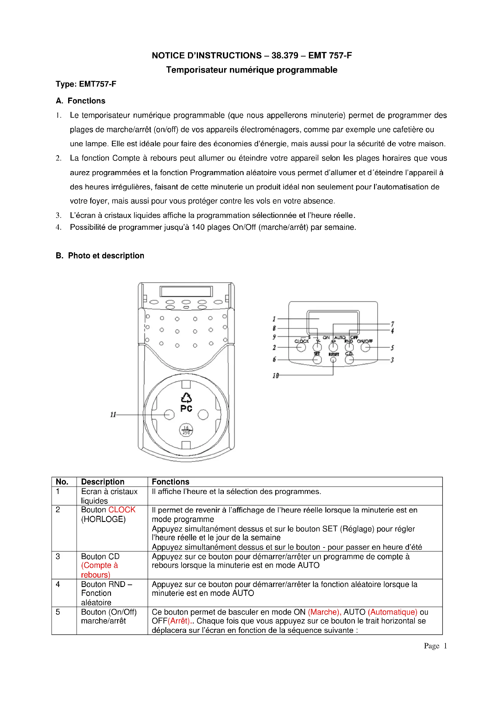 | 4 | Bouton RND - Fonction aléatoire | Appuyez sur ce bouton pour démarrer/arrêté la fonction aléatoire lorsque la minuterie est en mode AUTO |