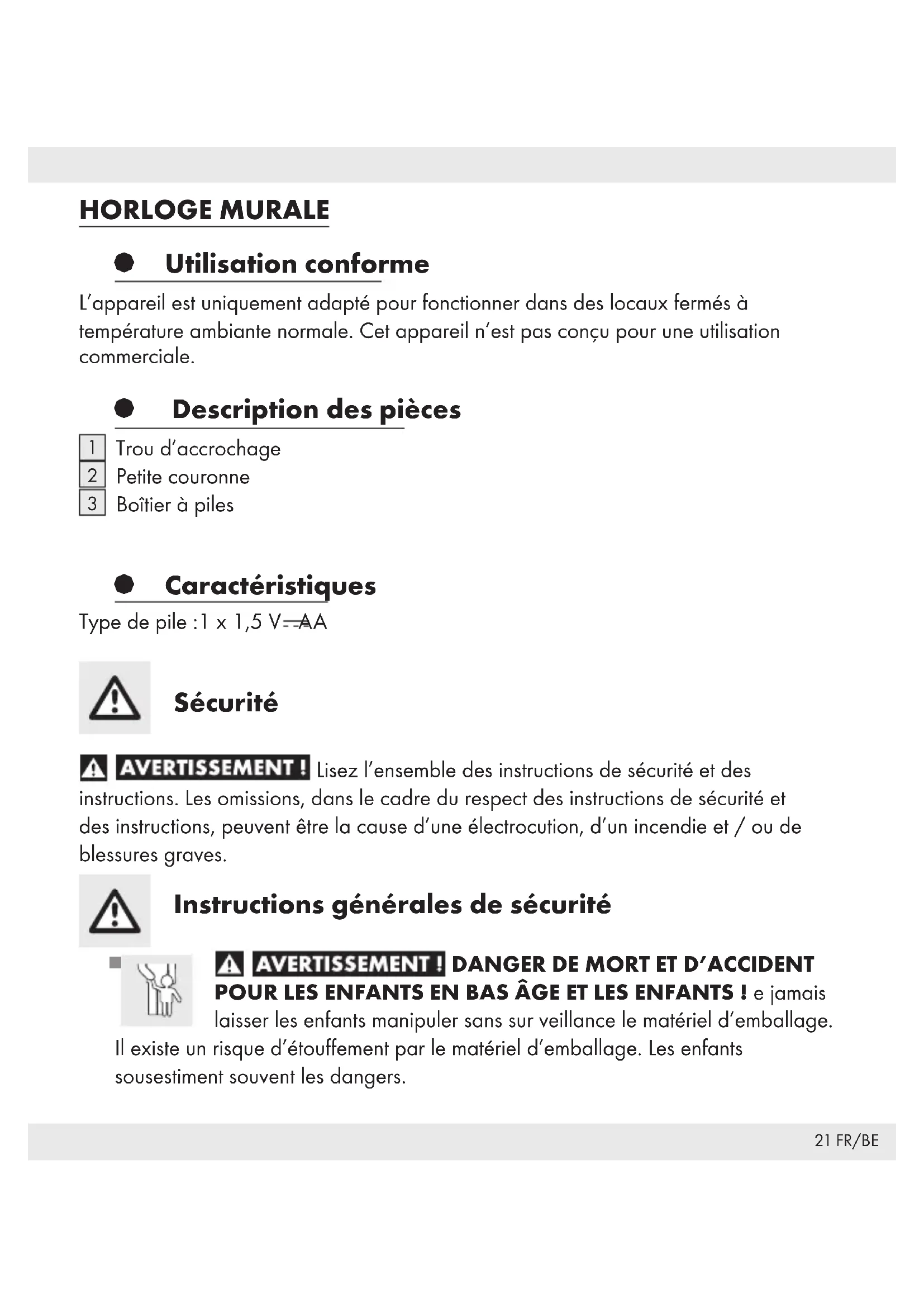 DANGER DE MORT ! es piles peuvent être avalées, ce qui peut être mortel. En cas d’ingurgitation d’une pile, il faut immédiatement consulter un médecin. Ne mettez pas l‘appareil en service s‘il est endommagé. Les réparations doivent être confiées uniquement à du personnel spécialisé. Consignes de sécurité relatives à la batterie DANGER DE MORT ! Les piles doivent être tenues hors de portée des enfants. En cas d’ingestion accidentelle, contactez l’assistance médicale d’urgence. ATTENTION ! DANGER D’EXPLOSION ! Ne rechargez jamais des piles non rechargeables, et ne courtcircuitez pas et/ou n’ouvrez pas les piles. Ne jetez jamais les piles dans l’eau ou dans le feu. N’exercez pas de charges mécaniques sur les piles. Risque de fuite de la batterie En cas de fuite de la batterie, retirez-la immédiatement de l’appareil afin de prévenir tout dommage. Évitez tout contact avec la peau, les yeux et les muqueuses. En cas de contact avec l’acide de la batterie, rincez abondamment la zone touchée avec de l’eau propre et contactez l’assistance médicale d’urgence.23 FR/BE Évitez les conditions et températures extrêmes qui peuvent avoir un impact sur les piles, p. ex. radiateurs, lumière directe du soleil. Retirez la batterie de l’appareil si vous ne comptez pas l’utiliser pendant une période prolongée. Risque de dommages matériels Utilisez uniquement le type de batterie recommandé ! Lorsque vous insérez la batterie, respectez les polarités ! Si nécessaire, nettoyez la batterie et les contacts de l’appareil avant d’insérer la batterie. Une batterie déchargée doit être retirée de l’appareil rapidement. § Mise en service Enlever l’isolation entre la pile et le contact. Veuillez vous reporter à la fig. B en ce qui concerne le remplacement de la pile. § Utilisation Réglage de l’heure Pour régler l’heure, faites tourner la petite couronne