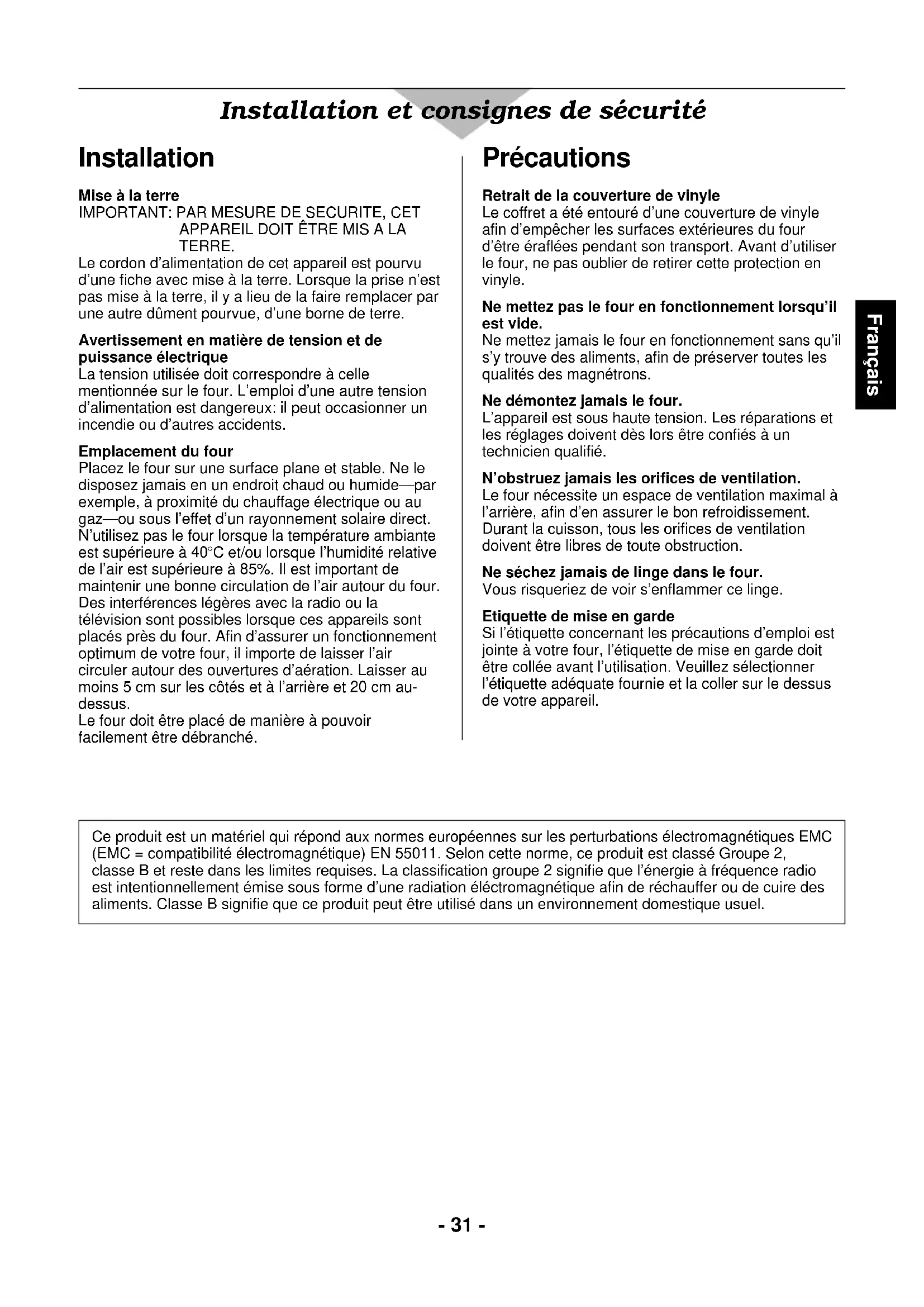 TERRE. Le cordon d’alimentation de cet appareil est pourvu d’une fiche avec mise à la terre. Lorsque la prise n’est pas mise à la terre, il y a lieu de la faire remplacer par une autre dûment pourvue, d’une borne de terre. Avertissement en matière de tension et de puissance électrique La tension utilisée doit correspondre à celle mentionnée sur le four. L’emploi d’une autre tension d’alimentation est dangereux: il peut occasionner un incendie ou d’autres accidents. Emplacement du four Placez le four sur une surface plane et stable. Ne le disposez jamais en un endroit chaud ou humide—par exemple, à proximité du chauffage électrique ou au gaz—ou sous l’effet d’un rayonnement solaire direct. N’utilisez pas le four lorsque la température ambiante est supérieure à 40oC et/ou lorsque l’humidité relative de l’air est supérieure à 85%. Il est important de maintenir une bonne circulation de l’air autour du four. Des interférences légères avec la radio ou la télévision sont possibles lorsque ces appareils sont placés près du four. Afin d’assurer un fonctionnement optimum de votre four, il importe de laisser l’air circuler autour des ouvertures d’aération. Laisser au moins 5 cm sur les côtés et à l’arrière et 20 cm au- dessus. Le four doit être placé de manière à pouvoir facilement être débranché. Installation et consignes de sécurité Précautions Retrait de la couverture de vinyle Le coffret a été entouré d’une couverture de vinyle afin d’empêcher les surfaces extérieures du four d’être éraflées pendant son transport. Avant d’utiliser le four, ne pas oublier de retirer cette protection en vinyle. Ne mettez pas le four en fonctionnement lorsqu’il est vide. Ne mettez jamais le four en fonctionnement sans qu’il s’y trouve des aliments, afin de préserver toutes les qualités des magnétrons. Ne démontez jamais le four. L’appareil est sous haute tension. Les réparations et les réglages doivent dès lors être confiés à un technicien qualifié. N’obstruez jamais les orifices de ventilation. Le four nécessite un espace de ventilation maximal à l’arrière, afin d’en assurer le bon refroidissement. Durant la cuisson, tous les orifices de ventilation doivent être libres de toute obstruction. Ne séchez jamais de linge dans le four. Vous risqueriez de voir s’enflammer ce linge. Etiquette de mise en garde Si l’étiquette concernant les précautions d’emploi est jointe à votre four, l’étiquette de mise en garde doit être collée avant l’utilisation. Veuillez sélectionner l’étiquette adéquate fournie et la coller sur le dessus de votre appareil. Ce produit est un matériel qui répond aux normes européennes sur les perturbations électromagnétiques EMC (EMC = compatibilité électromagnétique) EN 55011. Selon cette norme, ce produit est classé Groupe 2, classe B et reste dans les limites requises. La classification groupe 2 signifie que l’énergie à fréquence radio est intentionnellement émise sous forme d’une radiation éléctromagnétique afin de réchauffer ou de cuire des aliments. Classe B signifie que ce produit peut être utilisé dans un environnement domestique usuel.- 32 - Sécurité