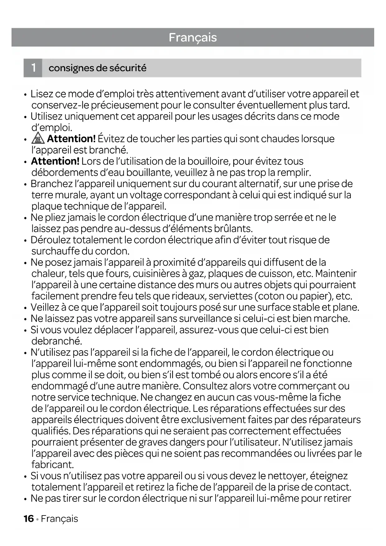 - Ne pas tirer sur le cordon électrique ni sur l’appareil lui-même pour retirer Français consignes de sécurité