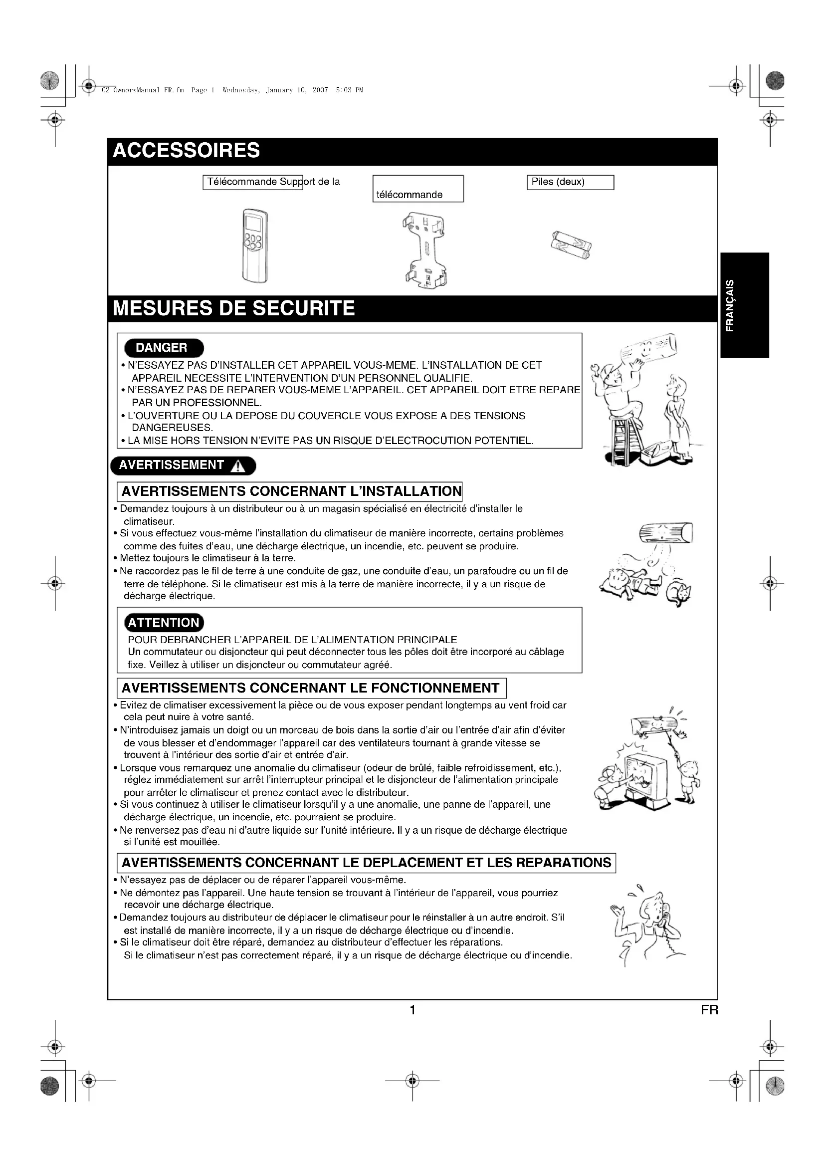 - Si le climatiseur doit être réparé, demandez au distributeur d’effectuer les réparations. Si le climatiseur n’est pas correctement réparé, il y a un risque de décharge électrique ou d’incendie. ACCESSOIRES