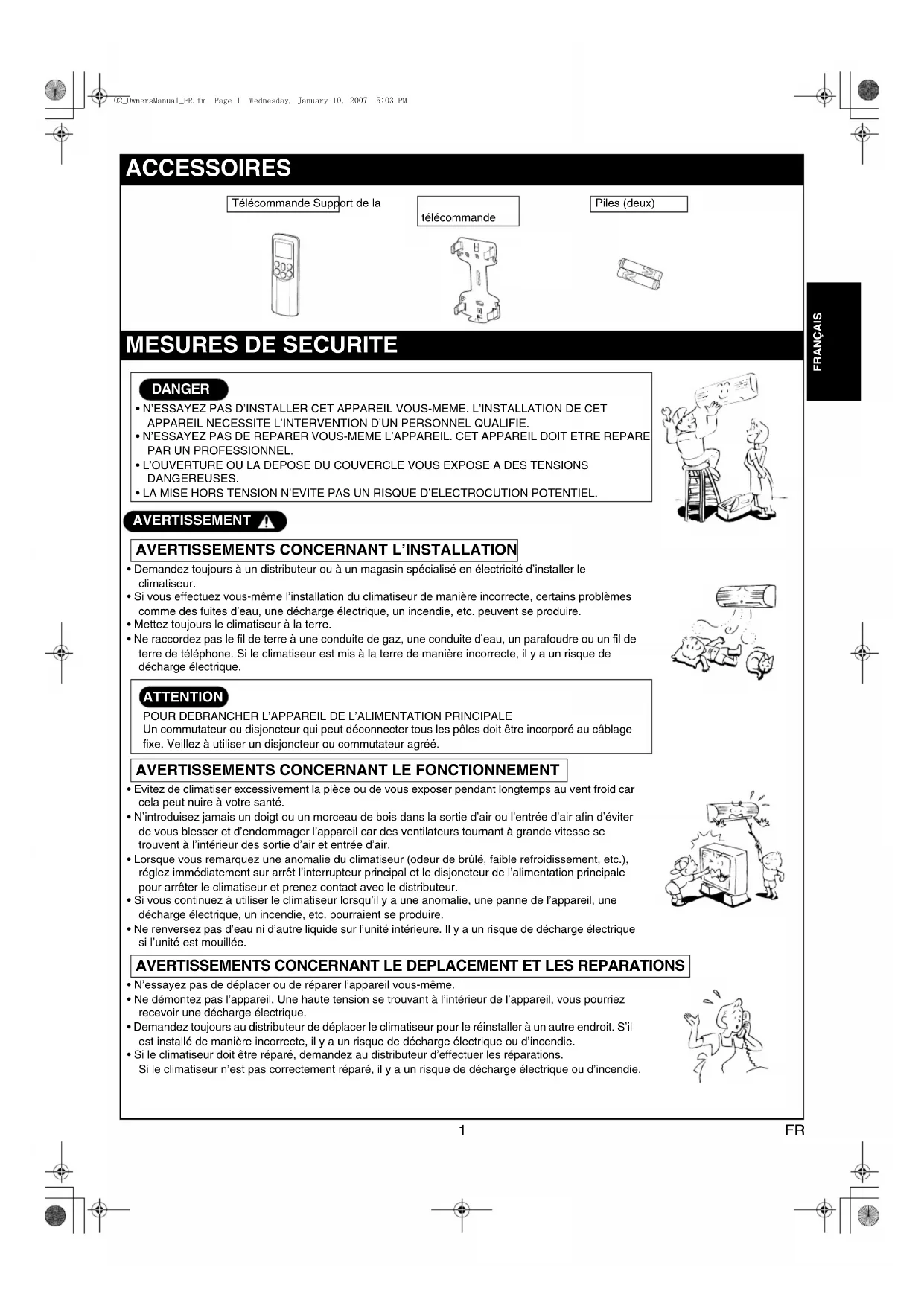 AVERTISSEMENTS CONCERNANT LE DEPLACEMENT ET LES REPARATIONS Télécommande Support de la télécommande Piles (deux) A1YPGTU/CPWCNA(4HO2CIG9GFPGUFC[,CPWCT[2/2